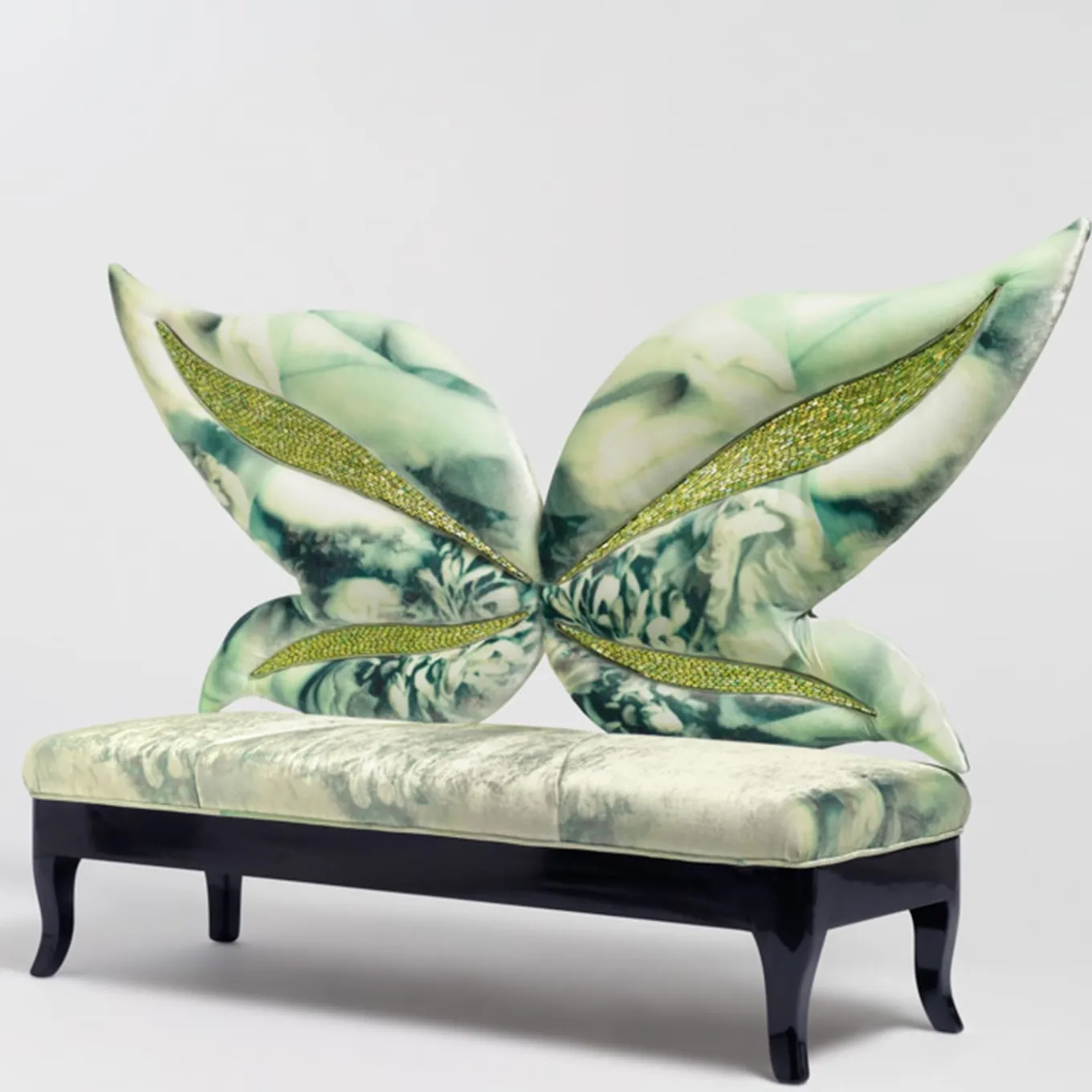 Come una farfalla le cui ali danno un senso di leggerezza, il dettaglio delle minuscole tessere del mosaico sullo schienale di questo divano crea un senso di profondità ed eleganza eterea allo stesso tempo.