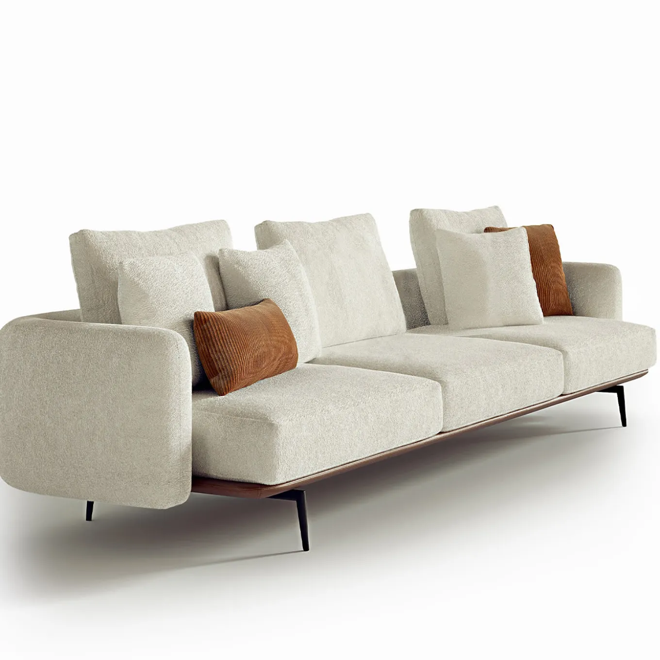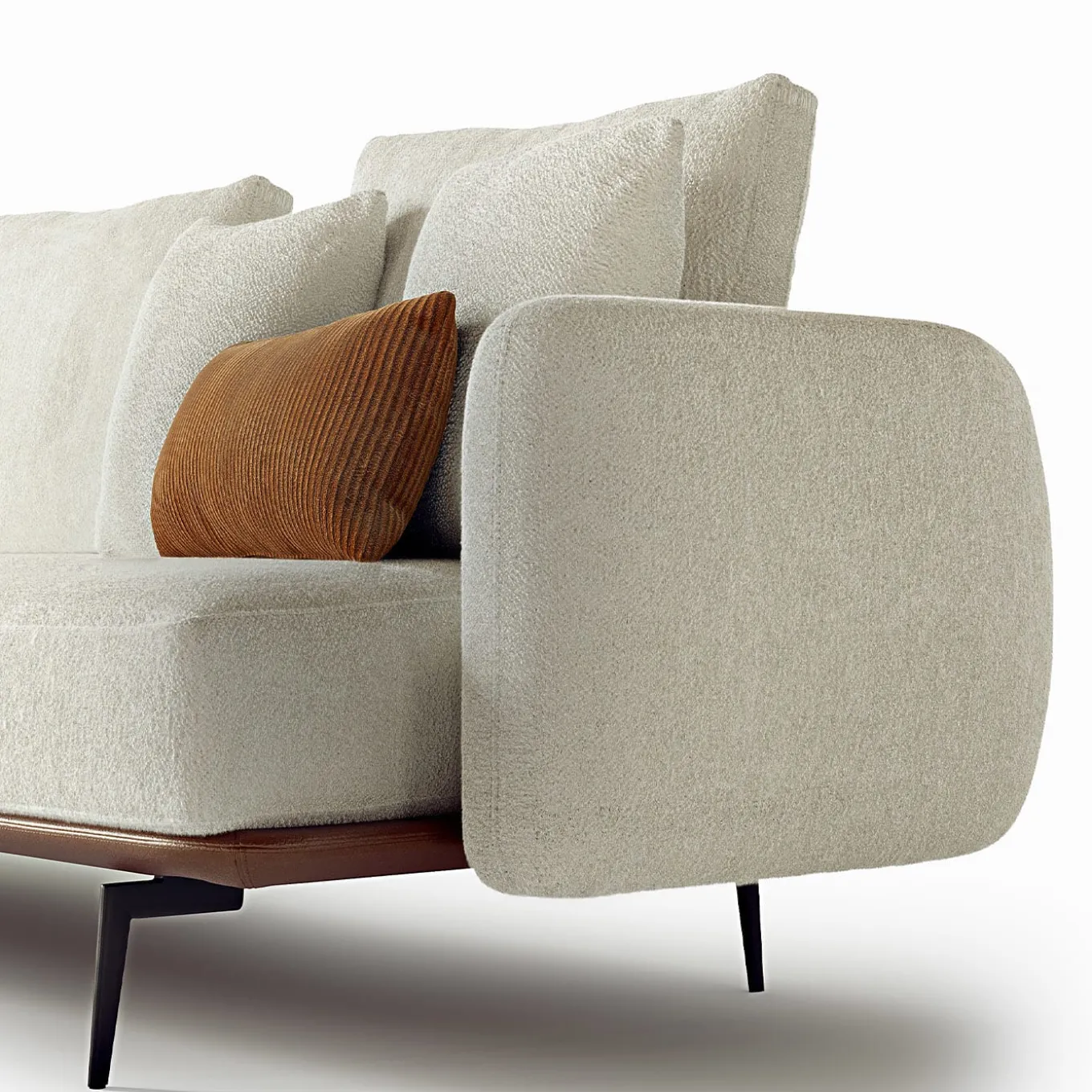 Divano componibile con struttura in legno, imbottitura in poliuretano a densità differenziata e base rivestita in pelle con cuciture. I piedi sono in metallo con finitura bronzo-oro, disponibili anche nelle finiture piombo e brunito. Rivestimento disponibile in tessuto, pelle e nabuk. I cuscini decorativi non sono inclusi.