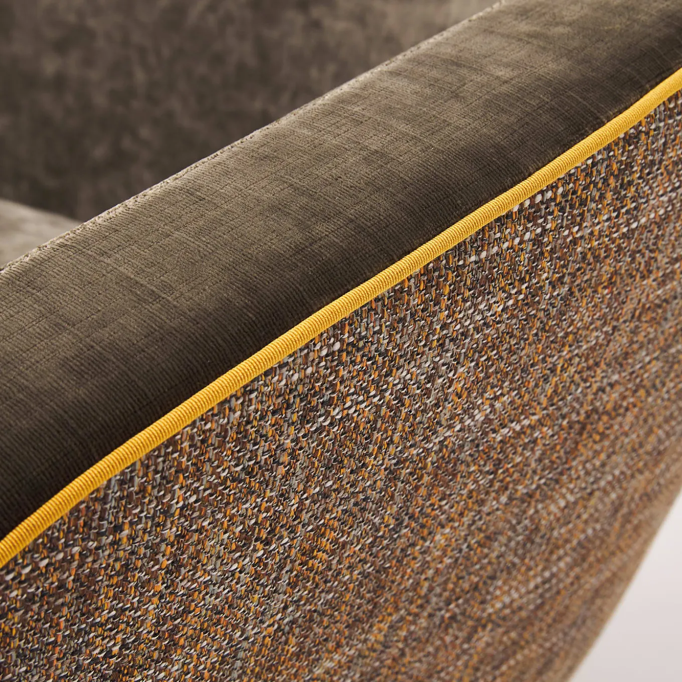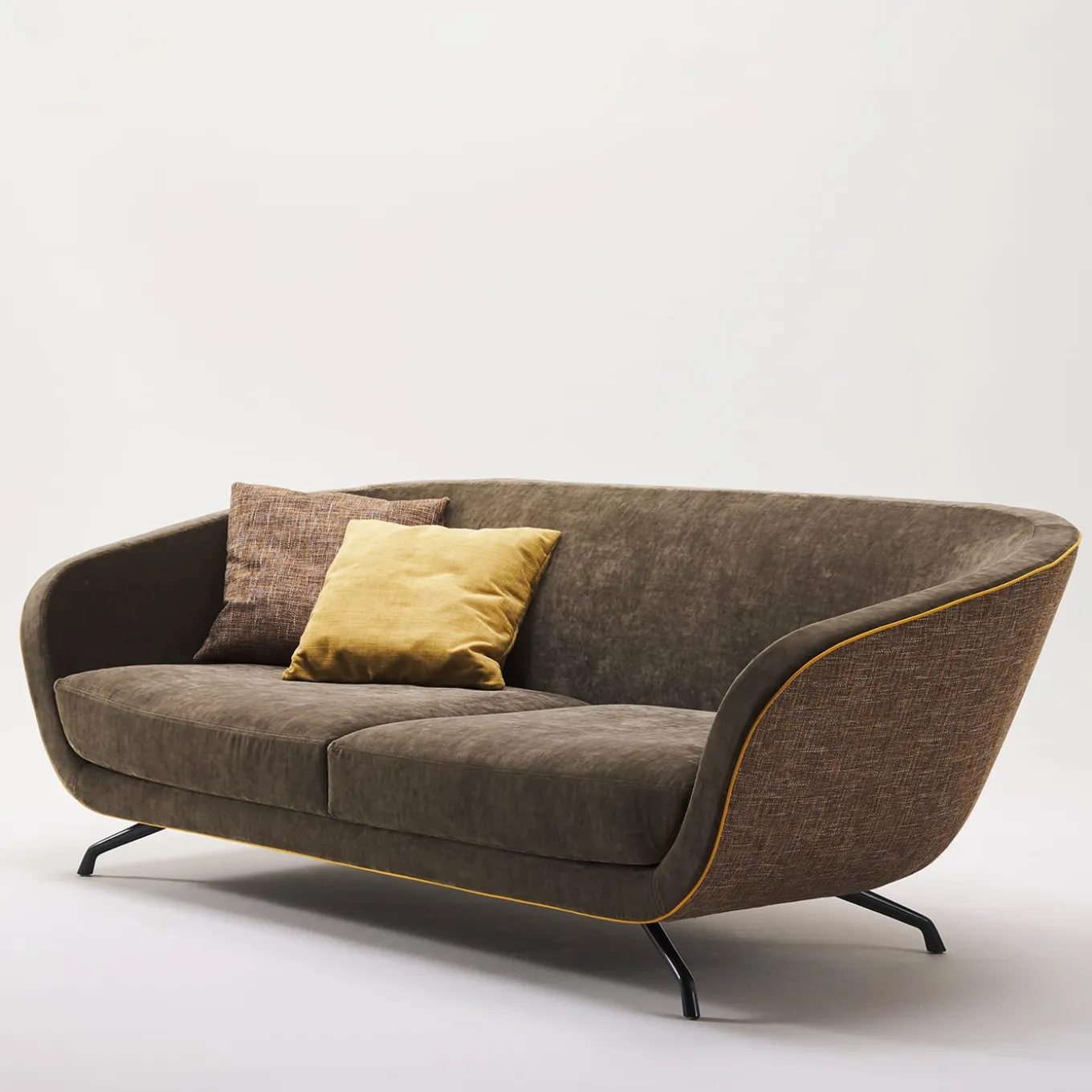 L’indulgenza per le curve fluide tipica dei design degli anni ’50 ha ispirato il design armonioso di questo divano. Sfidante nella sua idea di reinventare forme disegnate spontaneamente dalla natura, è caratterizzato da una scocca avvolgente che degrada dolcemente sui lati, il cui profilo è esaltato da un vivace bordino giallo. La generosa imbottitura in poliuretano espanso a densità differenziata testimonia il potenziale di comfort del progetto, perfezionato dal morbido rivestimento in tessuto di colore marrone. I cuscini non sono inclusi.