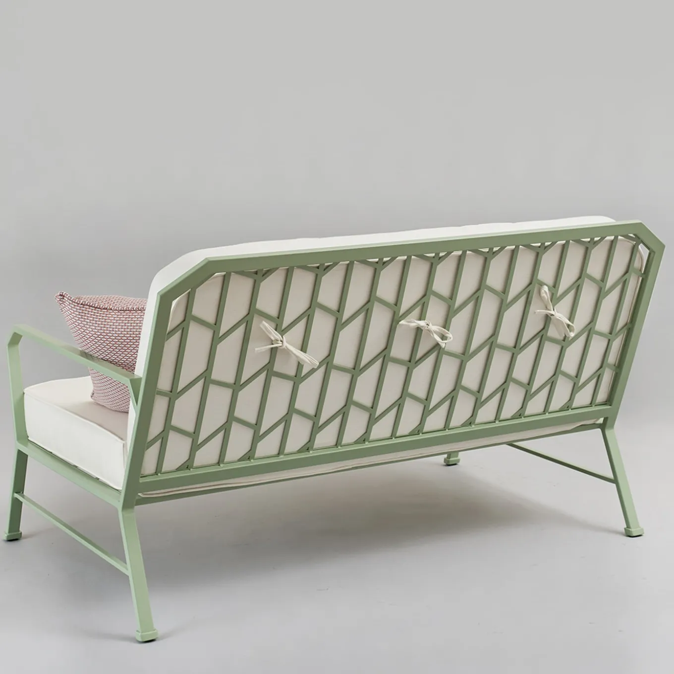Questo divano è dominato da influenze geometriche e da una seduta e uno schienale accoglienti e generosamente imbottiti, entrambi rivestiti in tessuto sunbrella Nattè bianco. Il suo carattere fresco, che si aggiunge a un patio o a un portico moderno, è sottolineato dalla tonalità verde tenue (RAL 6021) scelta per la verniciatura a polvere con cui è rifinita la struttura in acciaio inox. Il retro è impreziosito da un accattivante motivo traforato.
