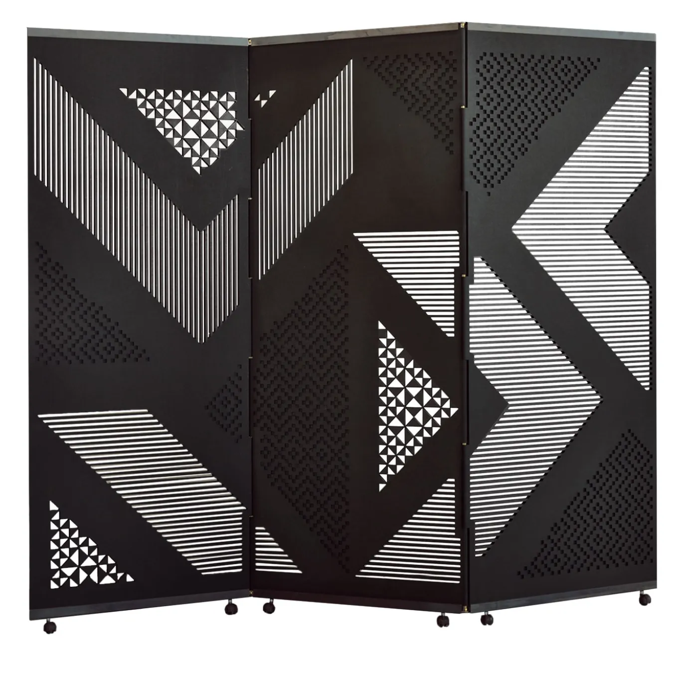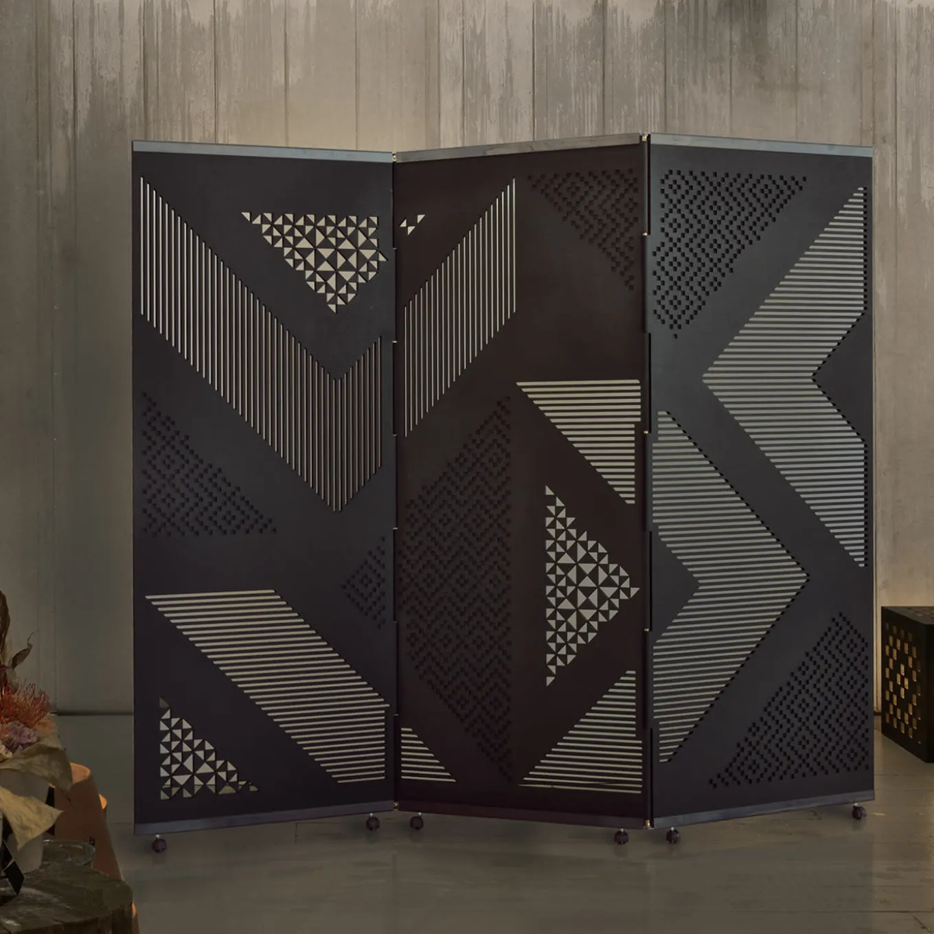 Motivi pantografati della tradizione tessile sarda conferiscono a questo divisorio un carattere iconico. Realizzato in MDF e tinto in nero, il design sarà una soluzione intelligente e di classe negli arredi moderni, che esalterà l’intimità senza rinunciare all’estetica. I tre pannelli poggiano su binari di ferro con piccole ruote che consentono di riorganizzarli senza problemi dove si desidera.