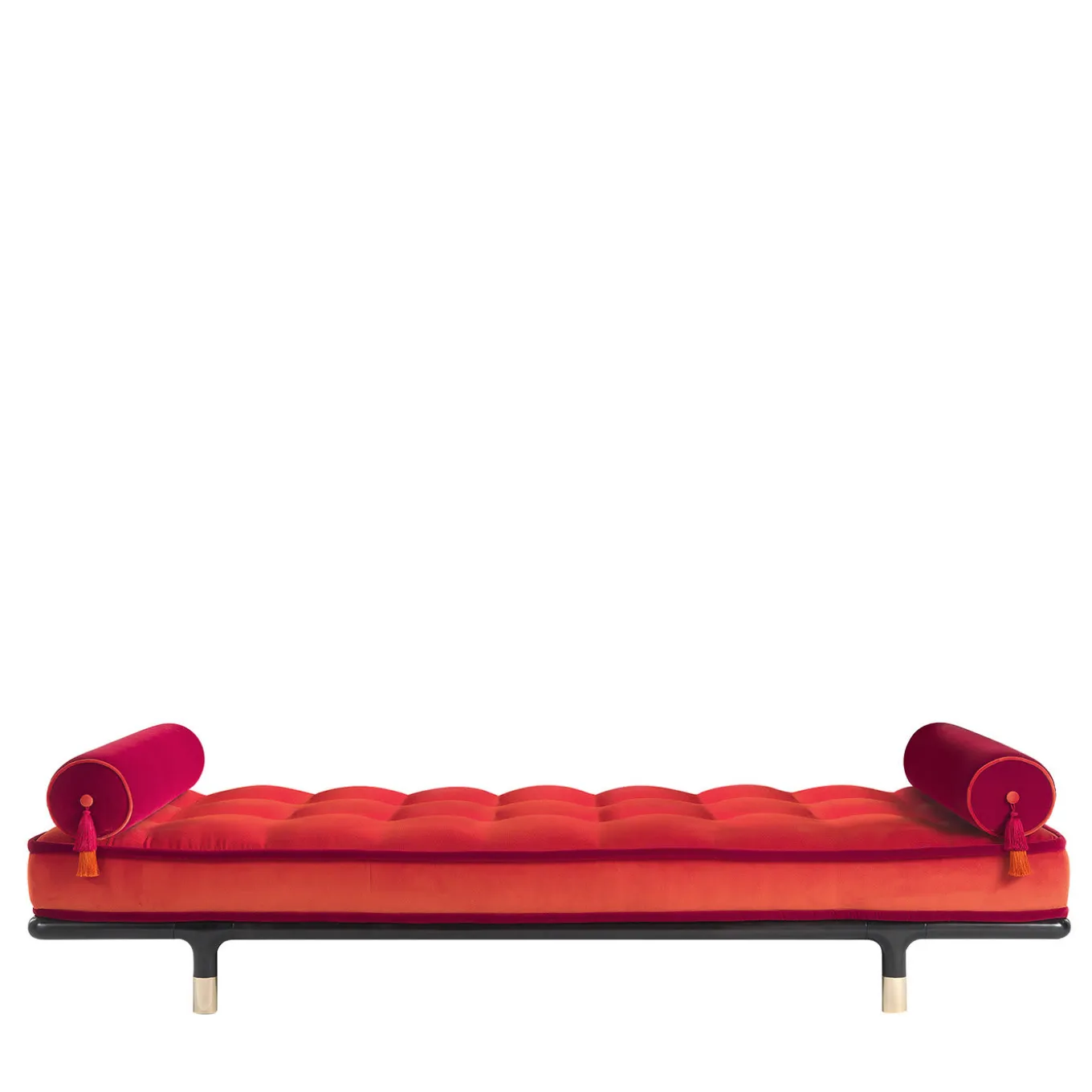 Una dormeuse dall’aspetto accogliente e confortevole, enfatizzato dalla conformazione a materasso della seduta. Dettagli raffinati come i puntali in ottone lucido del basamento e i cuscini a rullo con nappe decorative esaltano l’effetto complessivo, mostrando la straordinaria maestria artigianale che caratterizza l’intera collezione. Base Dormeuse in legno tinto wengè scuro con puntali in ottone lucido. Seduta in espanso rivestito in velluto cat. A Venezia col. 4 Arancio e bordatura in velluto cat. A Venezia col. 3 Rosso. Rotoli in espanso rivestiti in velluto cat. A Venezia col. 3 Rosso con profili in velluto cat. A Venezia col. 4 Arancione. Nappe ornamentali abbinate in seta. Consultare il Concierge per le opzioni di personalizzazione.