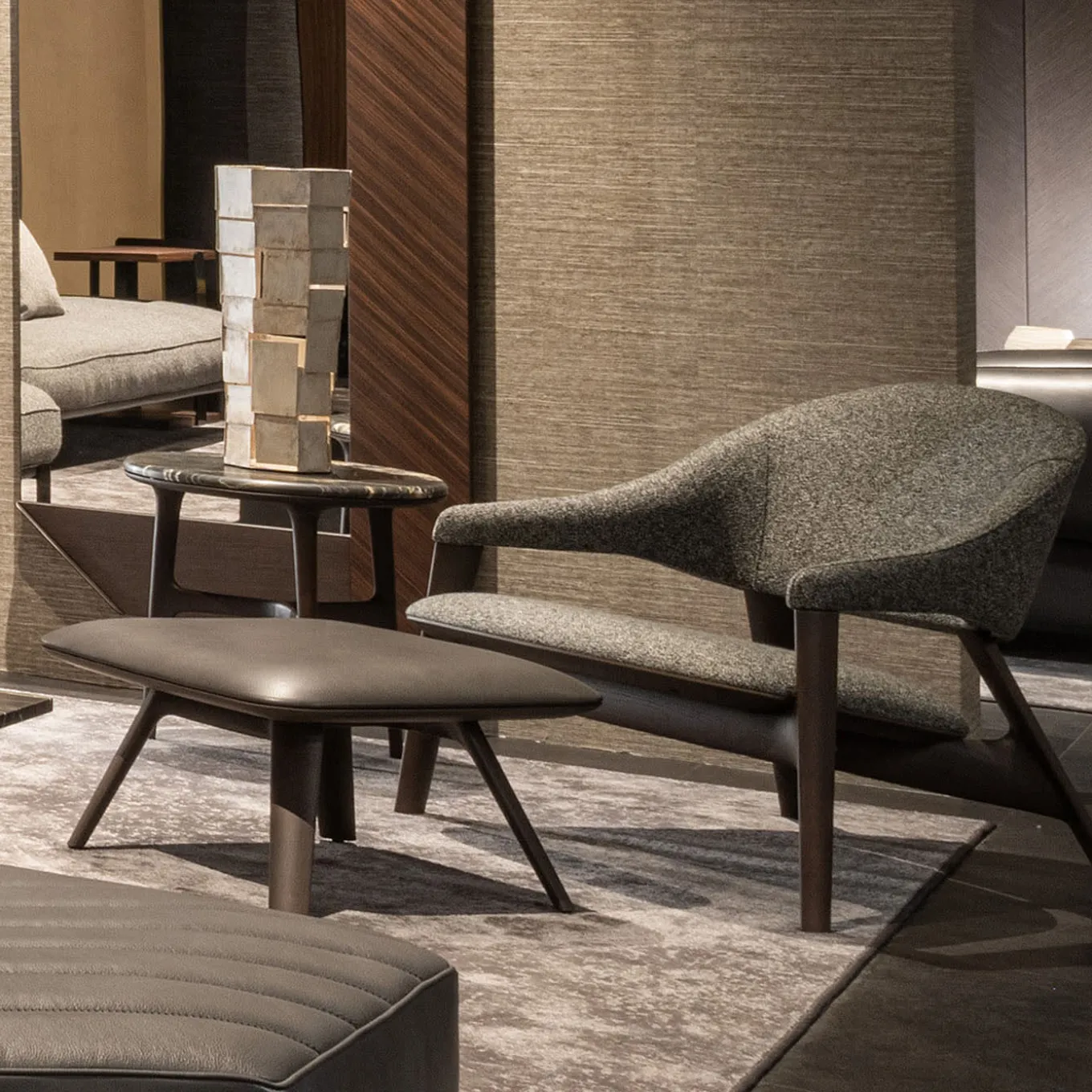 Profili armoniosi che ricordano elementi fitomorfi definiscono la silhouette elegante di questo raffinato tavolino. Esclusivo complemento d’arredo moderno alla ricerca di un pizzico di profondità cromatica, sfoggia un superbo piano rotondo in marmo Belvedere con bordi smussati che sigilla una fluida base a treppiede realizzata in frassino tinto grigio. L’uso del marmo implica l’unicità di ogni pezzo.