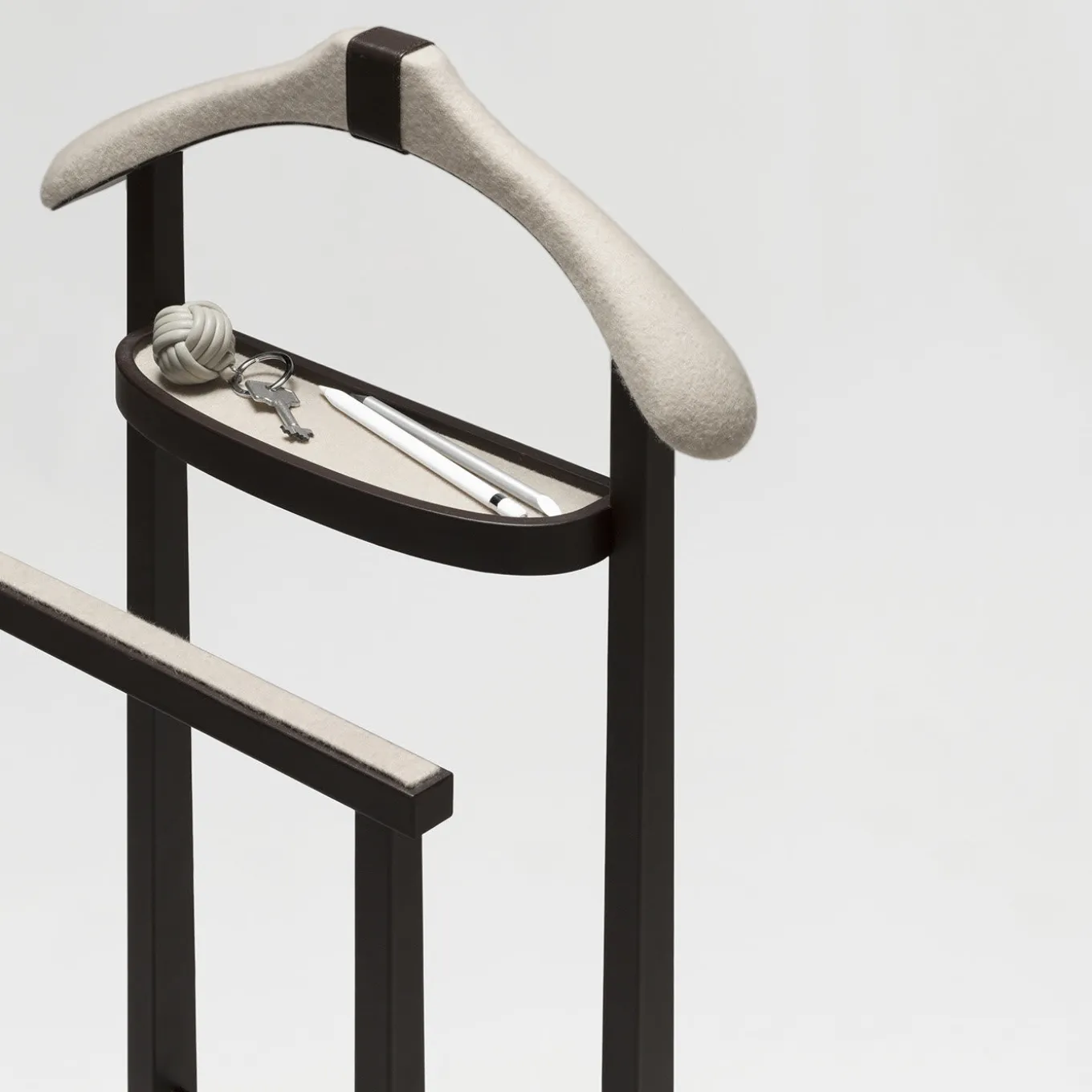 Contraddistinto da inserti in pregiato e sofisticato tessuto di cashmere sostenibile della Fratelli Tallia di Delfino, questo splendido appendiabiti farà bella mostra di sé in qualsiasi cabina armadio o camera da letto tradizionale o moderna. Realizzato in legno rivestito in pelle marrone e arricchito da barre in metallo cromato, è dotato di due supporti, un appendiabiti e un vassoio. Personalizzabile per dimensioni e finitura metallica (bronzo o ottone), chiedete al Concierge per i dettagli.