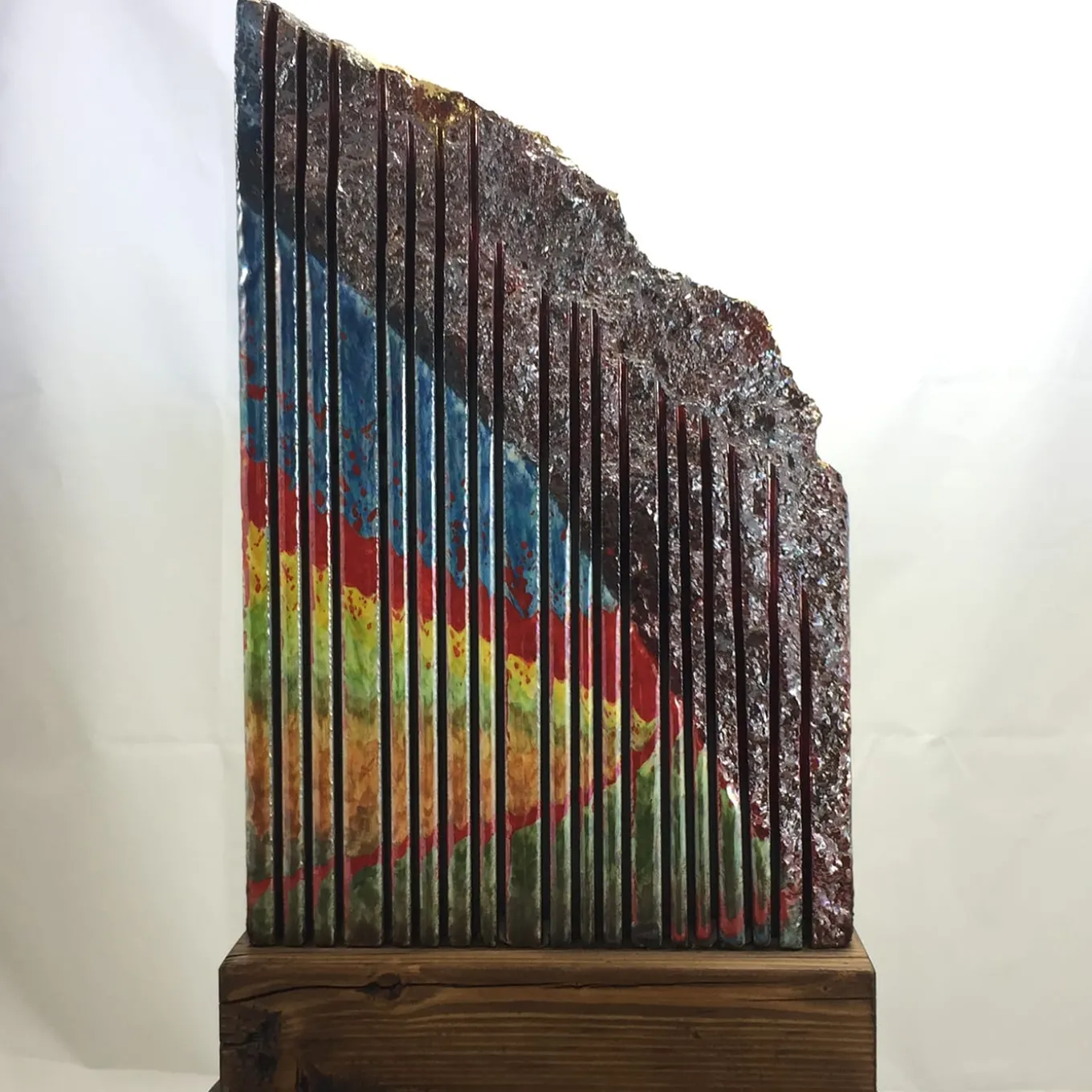 Un’opera d’arte mozzafiato su autentica pietra lavica dell’Etna, realizzata con la tecnica della ceramica a terza cottura e impreziosita da lustri metallici iridescenti. Il paesaggio si dispiega in una vivida composizione di rossi infuocati, blu profondi e verdi lussureggianti, che riflette la duplice natura del vulcano: forza di distruzione e culla di vita. Una figura femminile spettrale indugia in trasparenza, una presenza misteriosa che invita l’osservatore a esplorare l’ignoto.