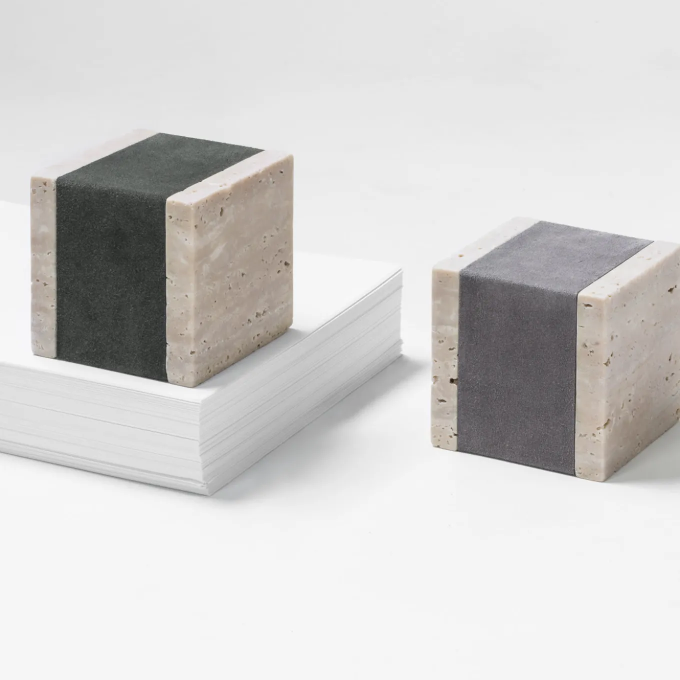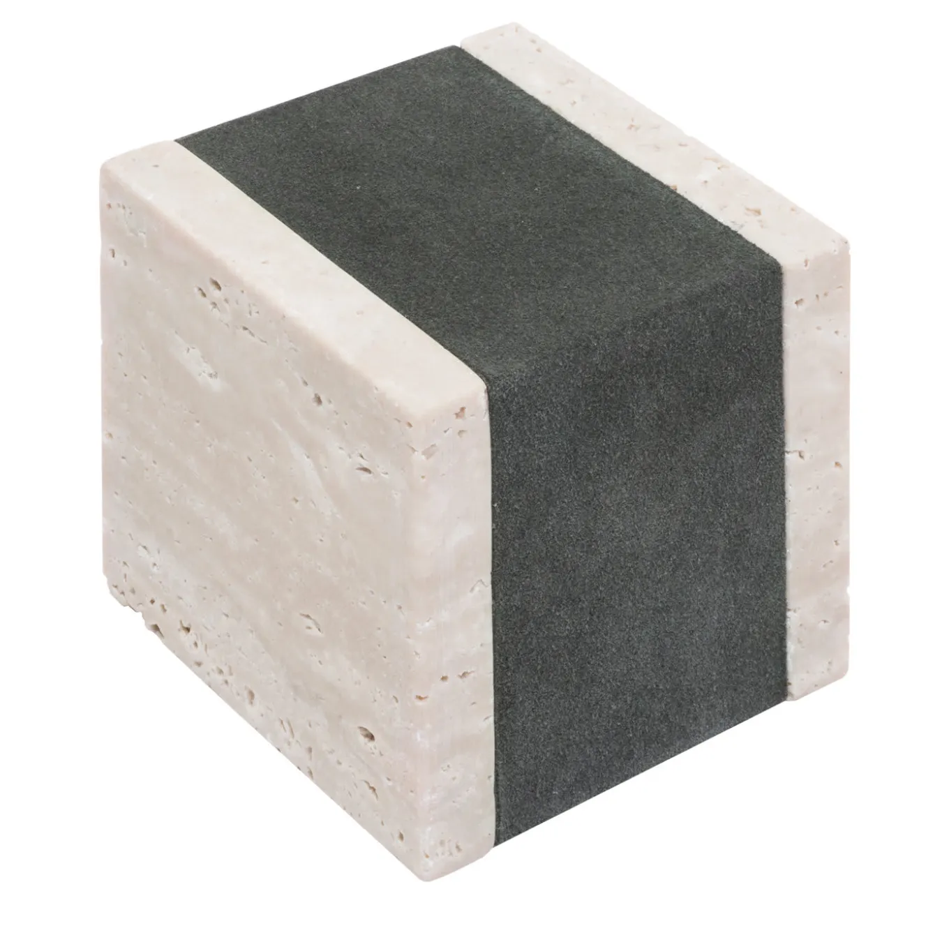 Questo oggetto scultoreo di arredamento funzionale è un elegante fermacarte da aggiungere a una scrivania moderna. La struttura minimalista e contemporanea è caratterizzata da materiali tradizionali che la rendono un pezzo magnifico e di forte impatto visivo. La struttura, a forma di cubo, è realizzata in marmo Travertino, ornato al centro da una spessa fascia in pelle marrone scuro. Altri marmi disponibili sono il bianco Arabescato, il verde Guatemala, il marrone Eramosa e il nero Portoro; per i dettagli di queste opzioni, contattare il Concierge.