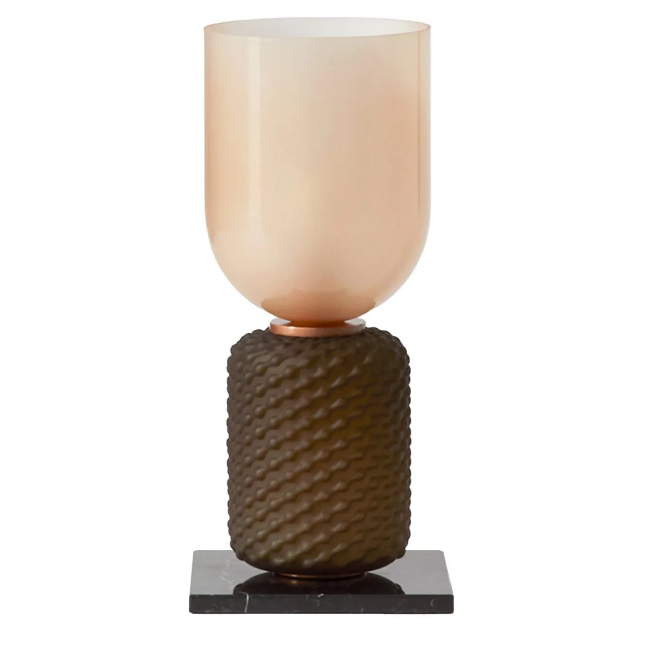 Ficupala – Lampada da tavolo. Ficupala si distingue per il suo stile eclettico, un incrocio tra postmodernismo e art déco, che richiama le forme organiche del regno vegetale. La lampada da terra e da tavolo ha un’altezza di 138 cm o 59 cm ed è dotata di una base in pregiato marmo di Marquinia e di un diffusore e corpo in vetro soffiato disponibile in diversi colori. Il modello a sospensione, invece, ha una struttura in oro rosa ed è lungo 120 cm.