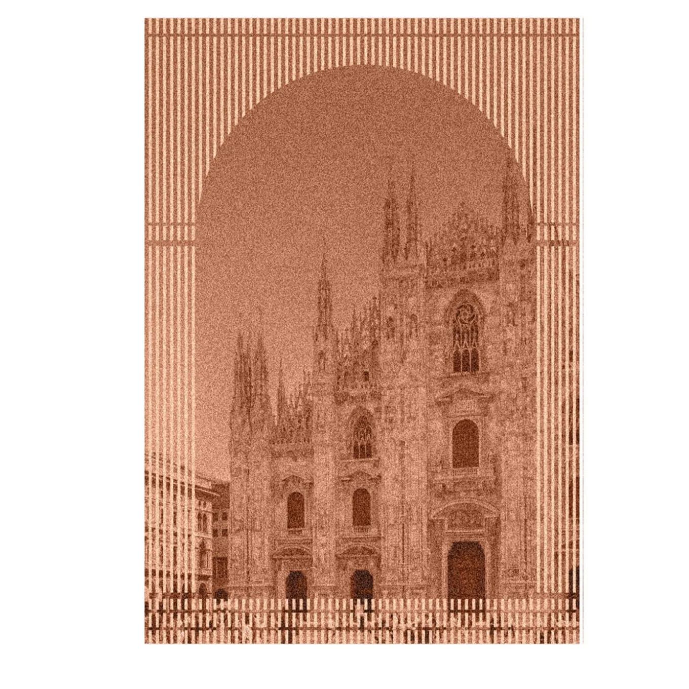 Parte di un trittico tessile dalla duplice funzione di coperta e arazzo, con ogni città visualizzata come un paesaggio visto da trifore appartenenti a diversi stili architettonici. Tessuto jacquard con tecnica piquè. 100% lana merino extra fine. 19,5 Micron.