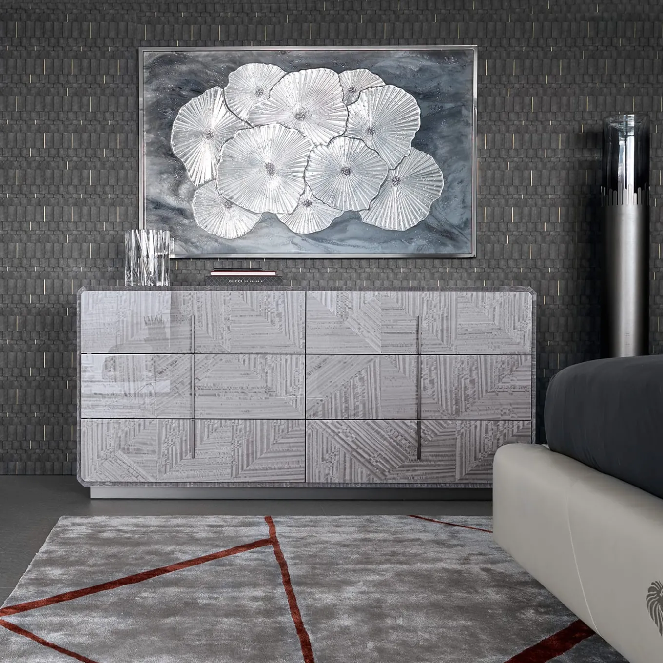 Scoprite questo quadro rettangolare con struttura in legno e cornice in acciaio inox. Base in resina epossidica con protezione UV in combinazione con cristalli “Swarovski” e vetro a specchio trasparente tagliato a mano.