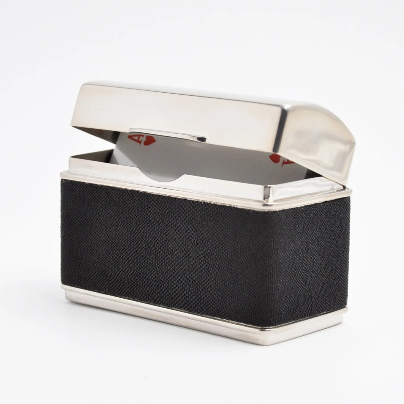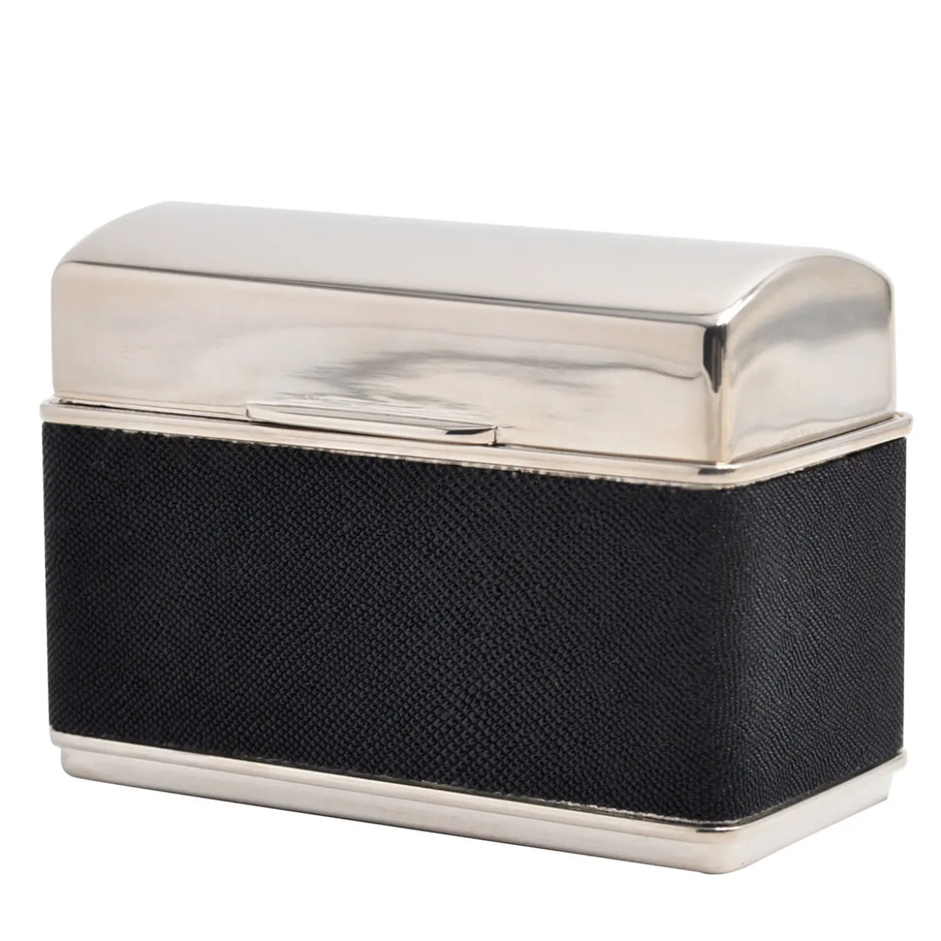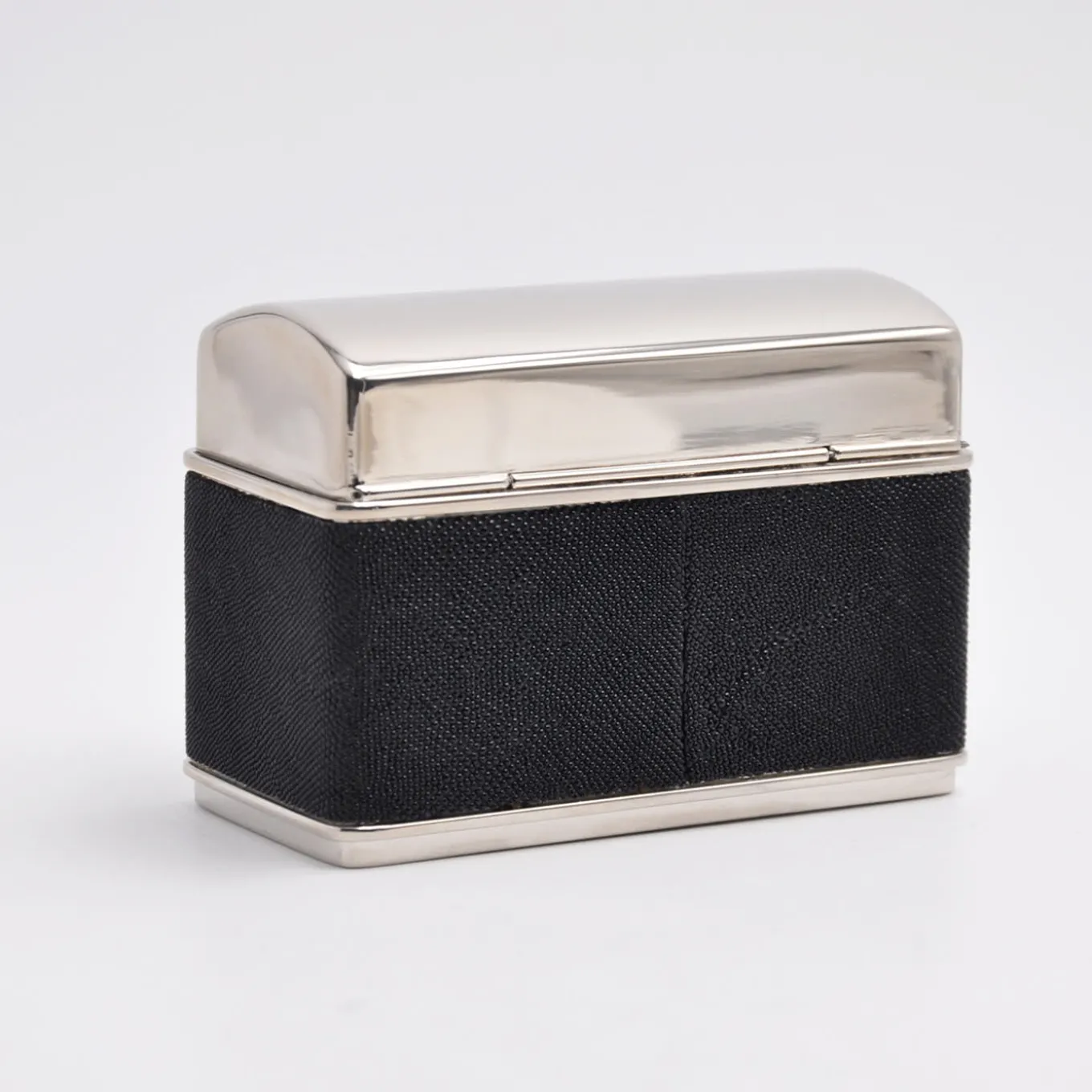 Sigarette o carte da gioco troveranno una casa di lusso all’interno di questa piccola e preziosa scatola a forma di piccolo baule. Realizzata in metallo lucido, si distingue per il rivestimento in autentica pelle di squalo, colorata in un’intensa tonalità di nero e caratterizzata da una grana finissima che ricrea un effetto tattile morbido. Disegnato e sapientemente realizzato a mano da Nino Basso per la Collezione Galucharme, viene consegnato in un’elegante scatola nera fumé insieme alle istruzioni per la cura.