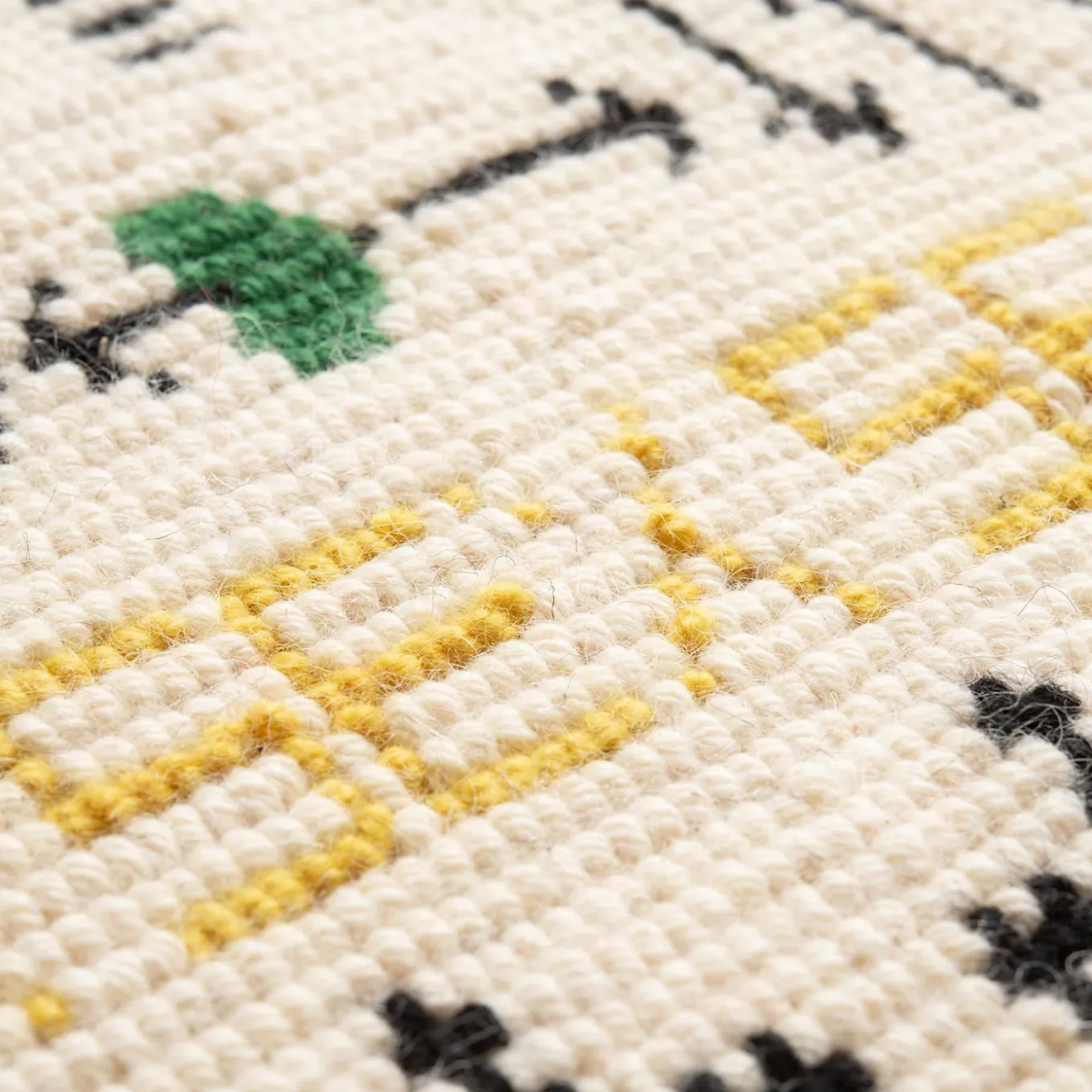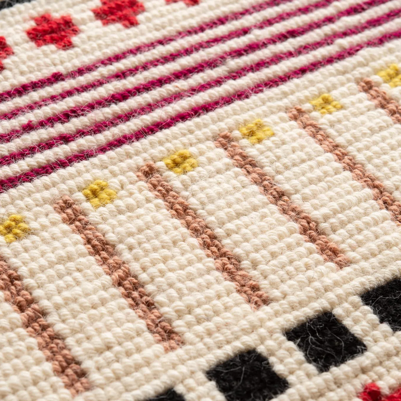 Ogni tappeto è un pezzo unico, realizzato a mano in Sardegna con un’antica tecnica di tessitura a grani originaria dell’isola, detta “a pibiones”. Sia l’aspetto del tappeto che la qualità della lavorazione trasmettono un senso di atemporalità e la creazione stessa preserva un mestiere antico e prezioso. Le forme geometriche e i colori ricorrenti diventano parte integrante di un linguaggio senza tempo, mentre i simboli geometrici emanano un potere visivo semplice ma intenso. Ogni tappeto nasconde segreti come scritture illeggibili.