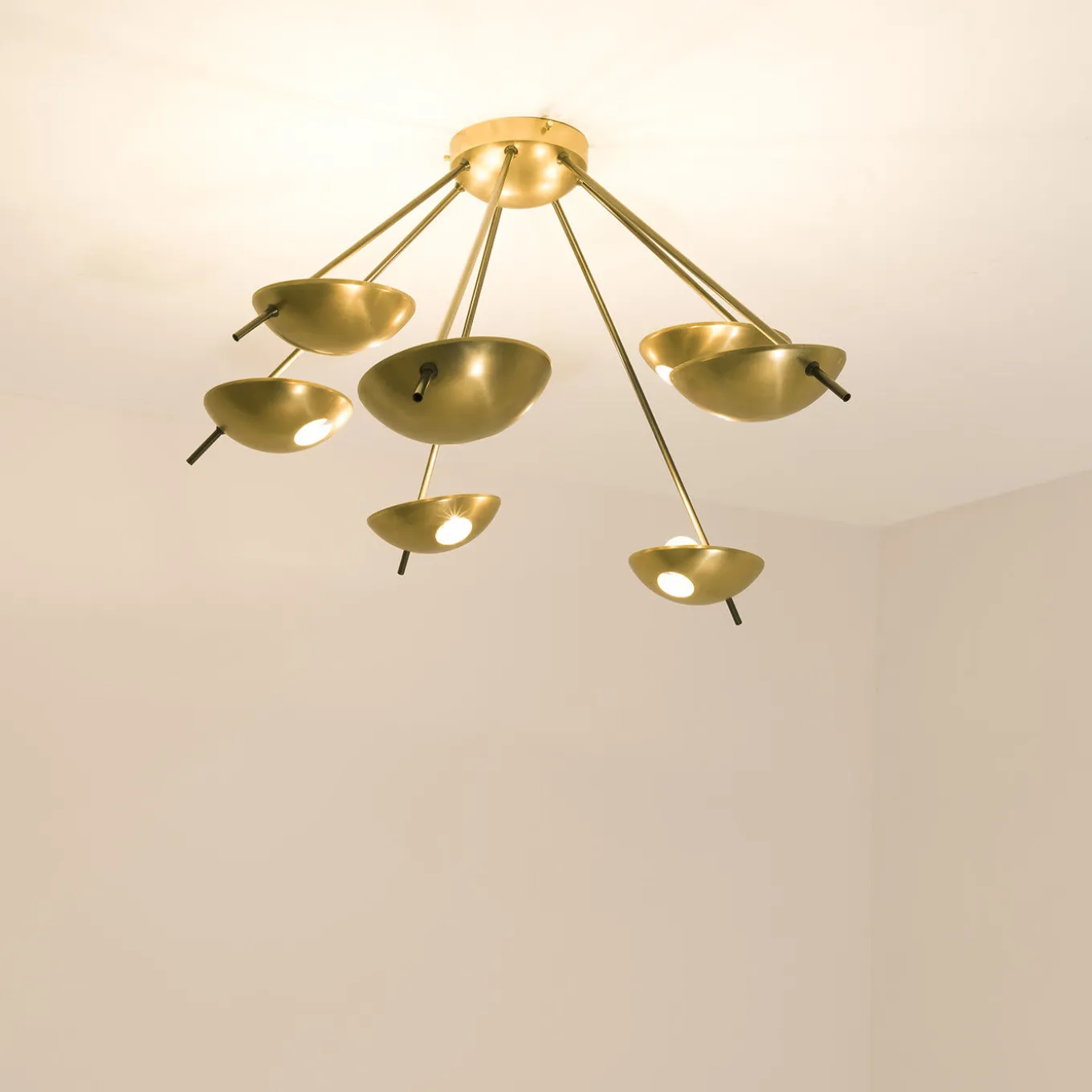Parte della collezione di lampade da soffitto e da parete Helios, questo pezzo può essere utilizzato sia per abbellire che per illuminare un interno contemporaneo. Elegante nella sua semplice ma dinamica silhouette in ottone ispirata alla meridiana, presenta un elemento centrale che sostiene sette steli che terminano ciascuno con un paralume semisferico. Disponibile in altri colori, è compatibile con lampadine a incandescenza e LED (non incluse) e può essere cablata per il Nord America (110V 60 Hz – lampadine con attacco E26) o per l’Europa (220V 50Hz – lampadine con attacco E27).