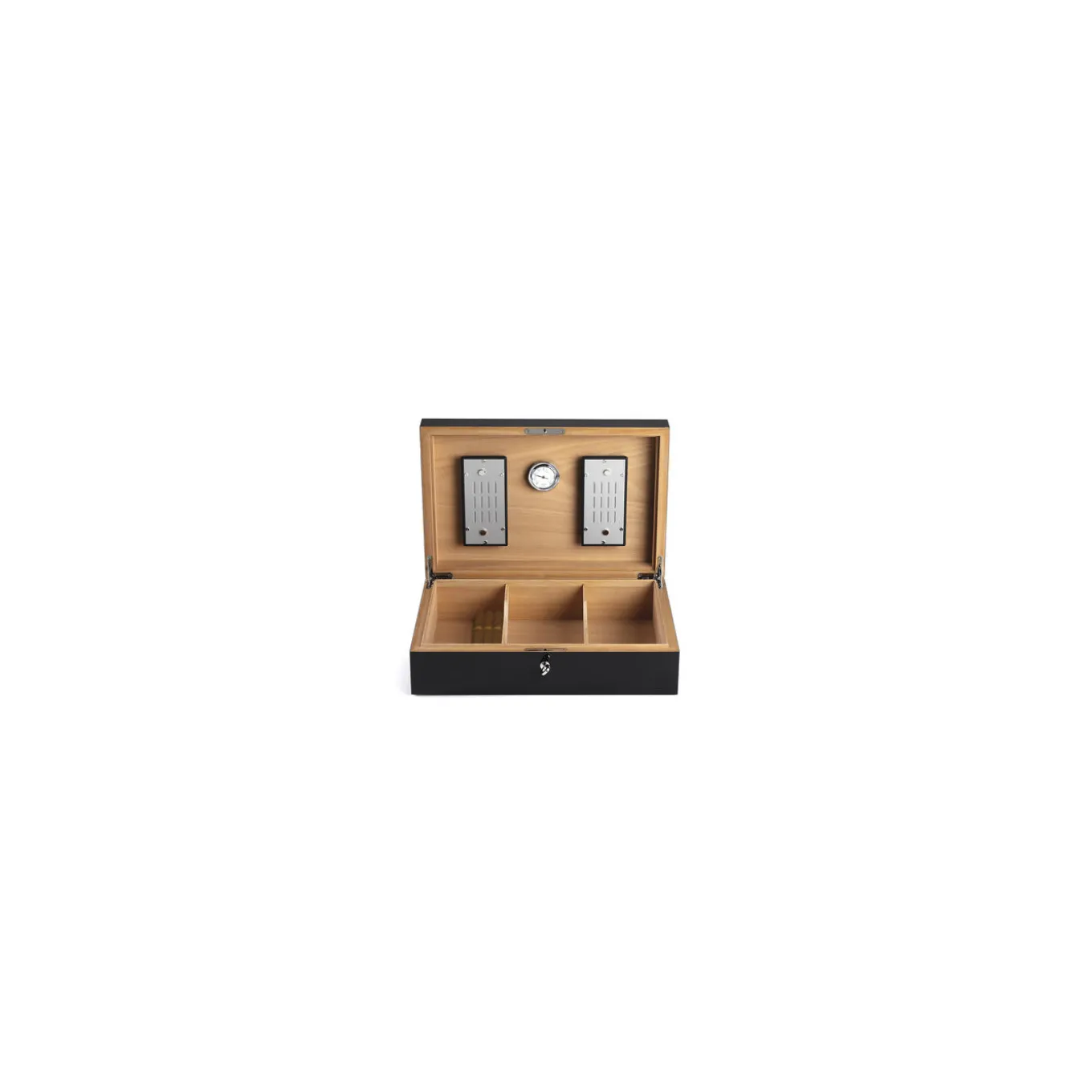 Impareggiabile maestria ed estetica moderna contraddistinguono questo humidor alla moda con una capacità di 110 sigari. Realizzato in legno con finitura scura, il pezzo è dotato di uno spazio interno per il controllo dell’umidità, di serratura e chiave e di una splendida decorazione sul coperchio che raffigura un’aquila imperiale in oro su uno sfondo blu reale.