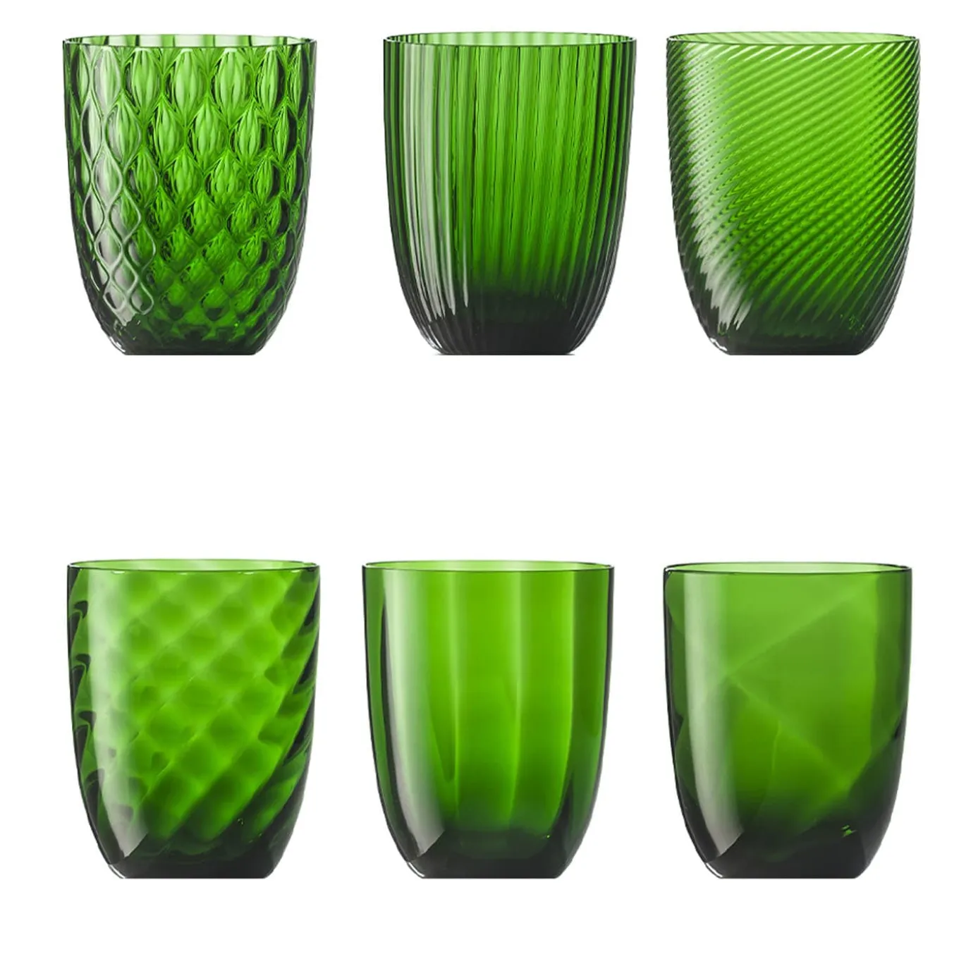 Con la stessa vivace tonalità verde pino, ognuno dei sei bicchieri da acqua che compongono questo set in vetro di Murano sfoggia un’elegante texture diversa, mutuata dalla secolare tradizione muranese: lente, ottico, ottico torsé, balloton, rigadin e torsé. Le sapienti fasi di soffiatura a bocca e di finitura manuale rendono ogni pezzo unico. Sono disponibili diverse opzioni di colore.