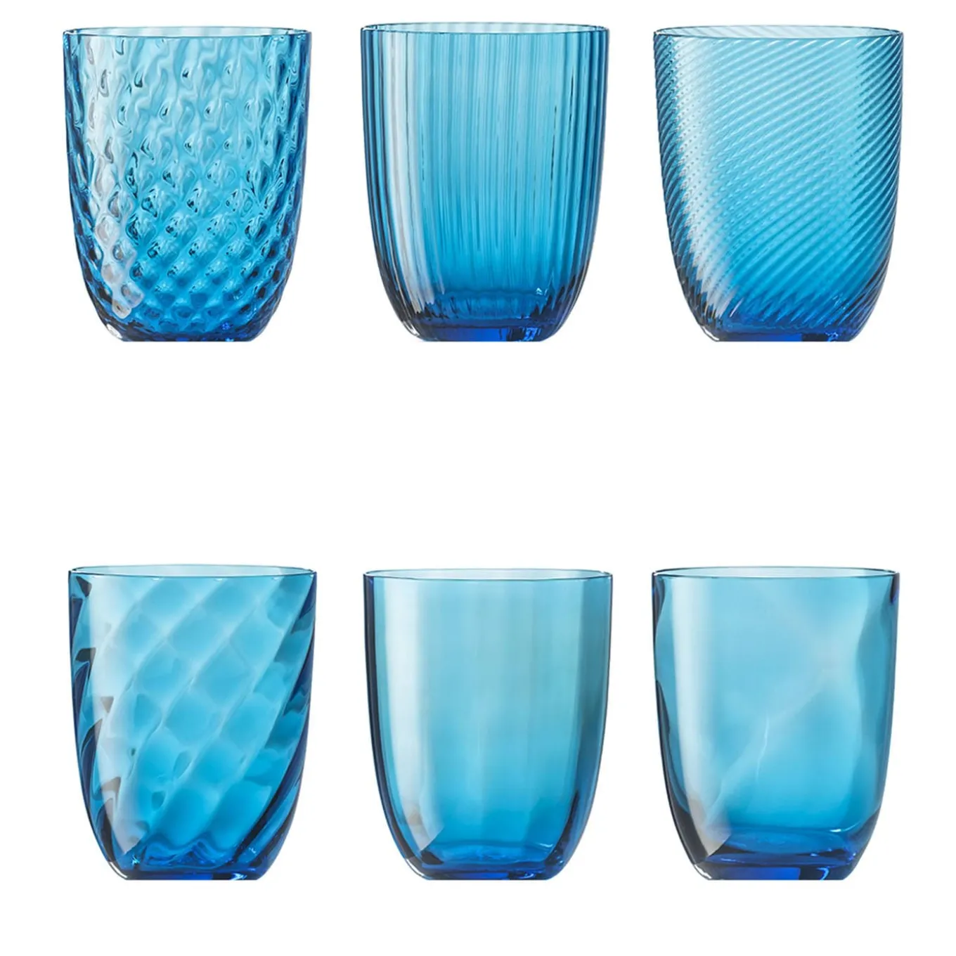 Parte della collezione Idra, questo meraviglioso set comprende sei bicchieri turchesi, ognuno dei quali presenta una texture diversa: lente, ottico, ottico torsé, balloton, rigadin e torsé. Un esclusivo processo di lavorazione artigianale che impiega tecniche tradizionali è alla base di ogni bicchiere, che è completamente unico nei suoi dettagli e nel suo peso. Sono disponibili diverse opzioni di colore.