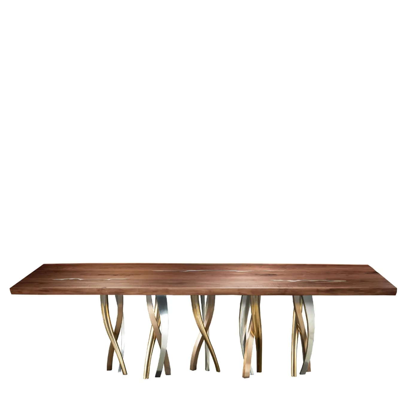 Fasci di gambe metalliche intricate e intrecciate, in finiture contrastanti di bronzo, champagne e nichel, dichiarano inequivocabilmente l’impatto scultoreo de Il Pezzo 8 Table. Sottoposto a un trattamento organico a base di silice per essere resistente all’acqua, un maestoso piano in noce suggella il design con un fascino senza tempo. Ogni pezzo include un cilindro in ottone con un numero di serie, il cosiddetto “pezzo mancante” da cui il marchio prende il nome.