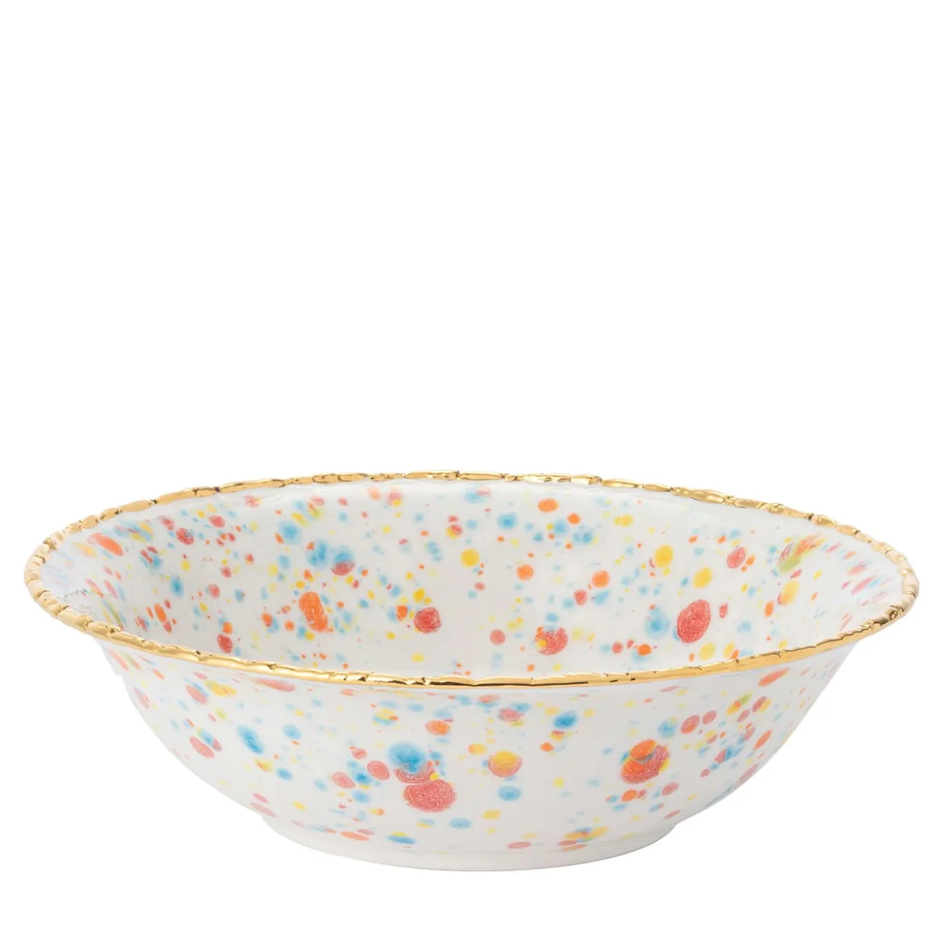 Ispirata alla semplice tradizione italiana della ceramica fatta a mano, questa piccola insalatiera fa parte della collezione Confetti, che prende il nome dal suggestivo motivo di puntini colorati che ne orna la superficie. Interamente realizzato a mano in porcellana, questo pezzo sarà una splendida aggiunta a una tavola eclettica o moderna, soprattutto se abbinato agli altri articoli della stessa serie per un look coeso. Lo sfondo bianco di questa funzionale ed elegante ciotola è punteggiato da macchie rosse, gialle e blu pallido e rifinito con un superbo accento in foglia d’oro sulla texture screpolata del bordo.