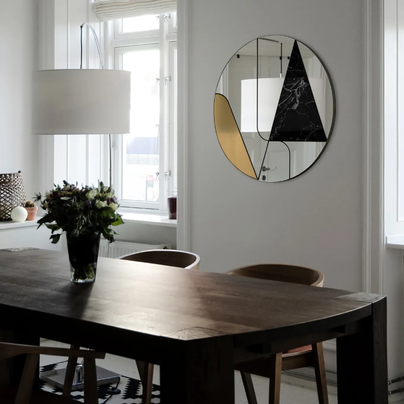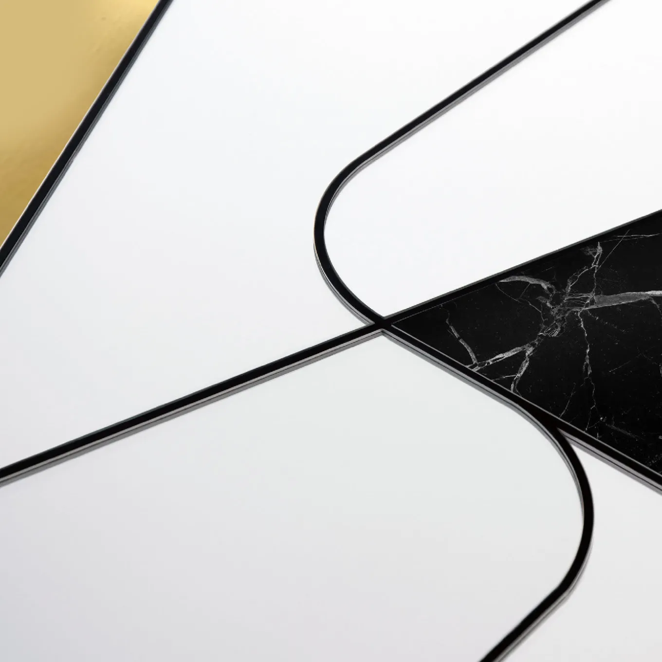 Una serie di linee taglia lo spazio all’interno della cornice rotonda di questo magnifico specchio, le cui superfici specchiate asimmetriche sono ornate da un inserto curvo in ottone spazzolato e da una lastra triangolare di marmo nero Marquina. Questo design accattivante è interamente realizzato a mano e creerà riflessi suggestivi in un interno moderno, aggiungendo una decorazione vivace con i suoi colori e finiture contrastanti. Il pezzo è sostenuto da una base in legno con una cornice in acciaio che incornicia le varie parti.