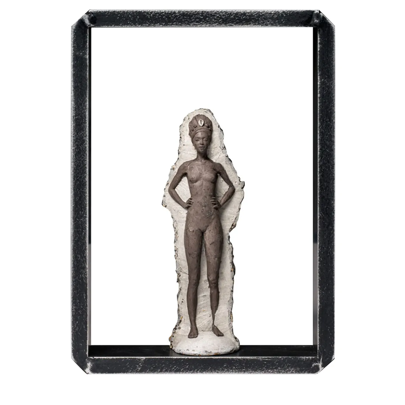 Dinamiche di genere e temi legati alla sostenibilità hanno ispirato gli artisti Francioni e Mastromarino a concepire questa singolare scultura che raffigura un improbabile papa donna. Una cornice in stile geometrico circonda la scultura centrale che, realizzata in lolla di riso e resina a base d’acqua, rivela una figura nuda che indossa un copricapo con una gemma d’argento a forma di vulva, simbolo di fertilità e potere femminile.