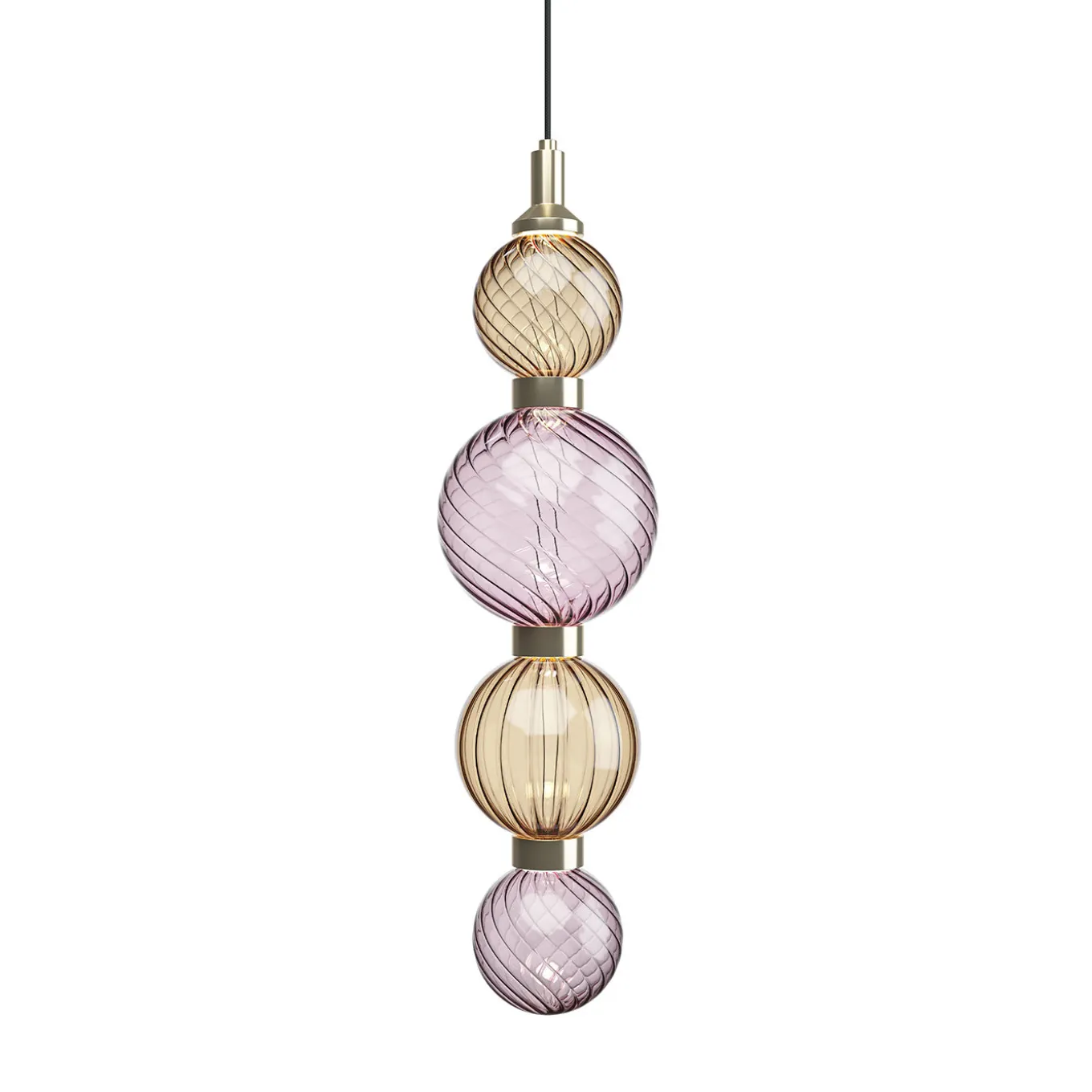 Questa magnifica lampada a sospensione, che fa parte di una collezione di apparecchi per l’illuminazione di grande effetto e raffinatezza, sarà il complemento perfetto per un soggiorno o un corridoio moderno. Montata su una struttura in metallo con finitura champagne dorata, presenta quattro sfere in vetro pirex impreziosite da finiture alternate in bronzo e ametista. Dotata di un cavo in tessuto nero e di lampadine LED di supporto. Disponibile in altre combinazioni di colori, chiedere al Concierge per ulteriori dettagli.