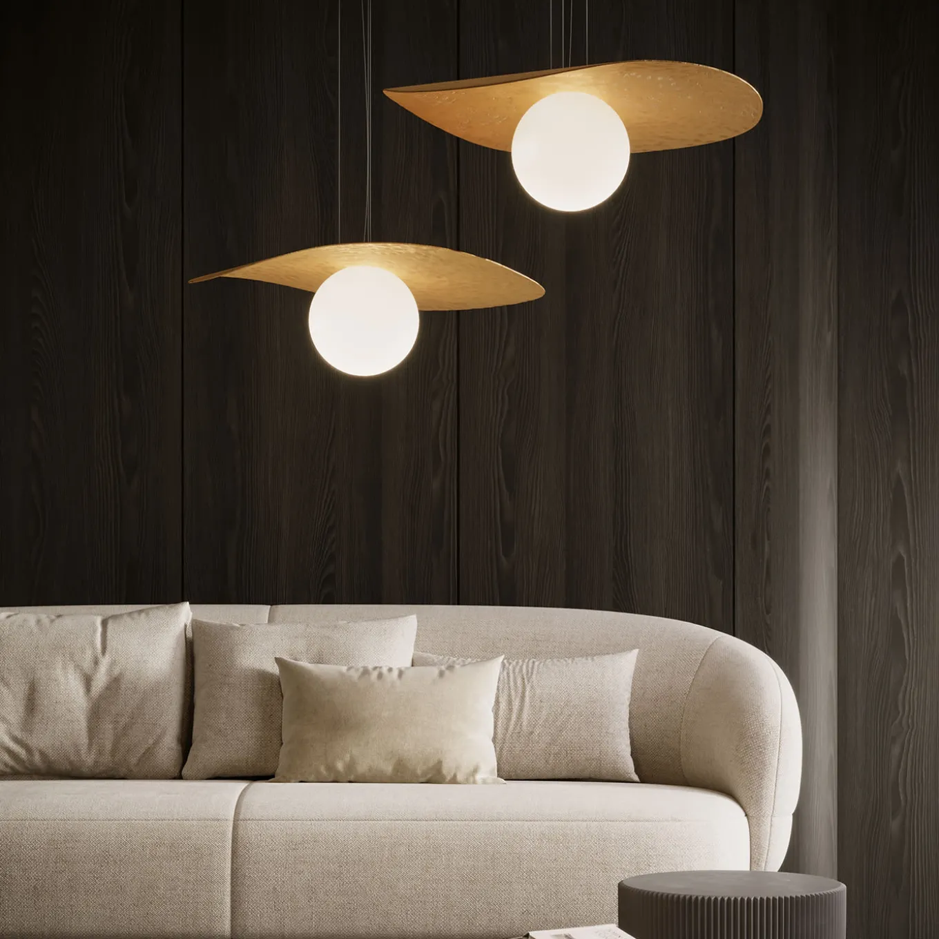 Un disco di metallo dorato leggermente curvato, fissato a una sfera di vetro bianco che ospita la fonte di luce, segna l’incredibile grazia di questa lampada a sospensione. Scendendo da un supporto rotondo coordinato al soffitto attraverso fili sottili, la struttura ricorda poeticamente un petalo, qui esaltato dal bagliore che irradia da un’unica lampadina E27. Un’aggiunta superba agli interni moderni e contemporanei, il design è disponibile anche in una variante argentata brillante. Dimmerabile su richiesta.
