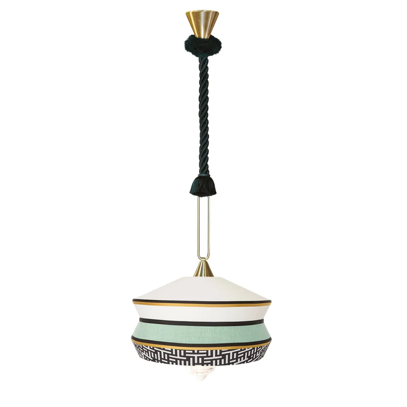 Calypso è una collezione di sospensioni ispirata al periodo art déco, con tessuti le cui trame e fantasie bianche e nere si mescolano con i colori vivaci della cultura sudamericana e tropicale, fornendo un risultato molto originale. L’interno è caratterizzato da una corda di seta intrecciata verde. Il supporto metallico è un anello in ottone satinato. Il diffusore è in vetro trasparente.