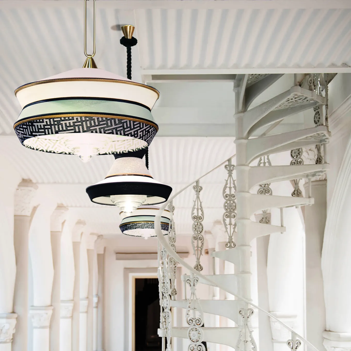 Calypso è una collezione di sospensioni ispirata al periodo art déco, con tessuti le cui trame e motivi geometrici bianchi e neri si mescolano ai colori vivaci della cultura sudamericana e tropicale, offrendo un risultato molto originale. La versione per interni è caratterizzata da una corda di seta intrecciata verde. Il supporto metallico è un anello in ottone satinato. Il diffusore è in vetro trasparente. Sorgente luminosa: 1 lampadina LED E27.