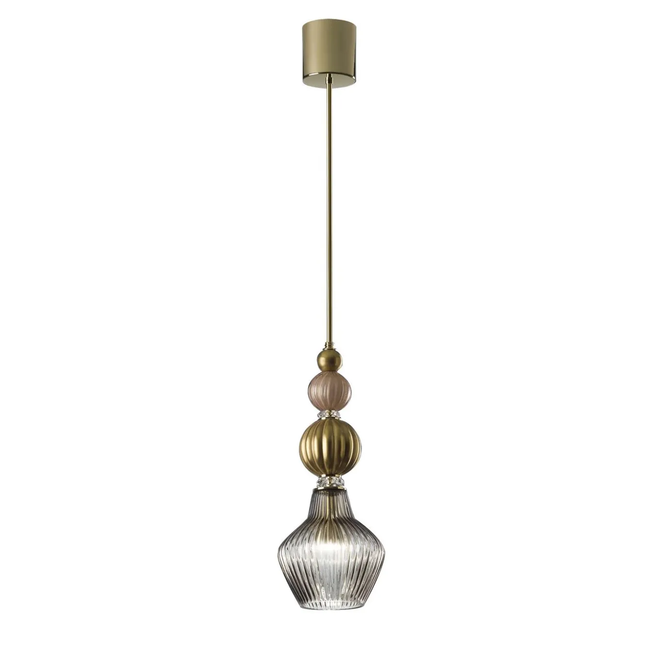 Capolavoro di eleganza e artigianato artistico, questa lampada a sospensione è uno straordinario pezzo di arredamento funzionale. Il suo stelo verticale in ottone (regolabile e alto fino a 200 cm) è ornato da una pila di sfere di porcellana impreziosite da delicate scanalature sulla superficie. Il paralume in vetro di Murano soffiato a bocca completa questa squisita opera d’arte, parte della collezione Divas.