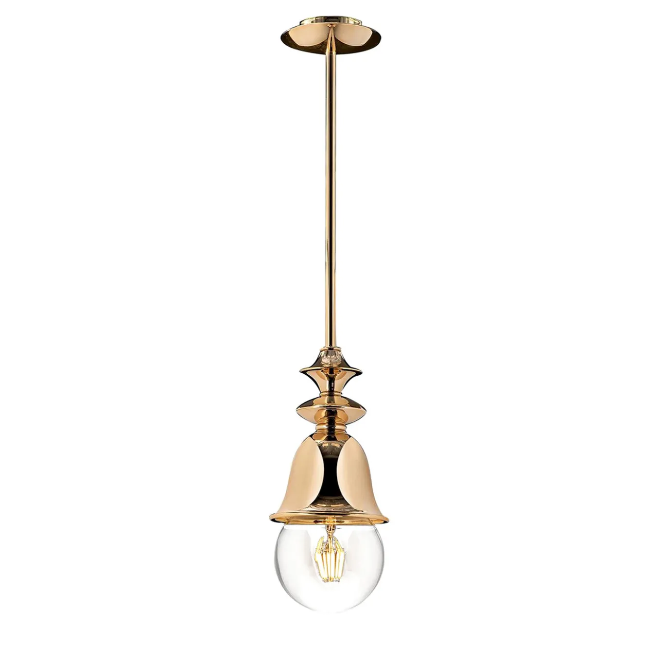 Omaggio all’eleganza minimalista, questa lampada a sospensione è caratterizzata da un paralume superbamente lavorato che vanta una forma a campana collegata alla piastra rotonda del soffitto grazie a un sottile stelo tubolare. Questo pezzo è realizzato in ottone e metallo con finitura oro lucido ed è disponibile anche in altri colori; per informazioni, contattare il Concierge.