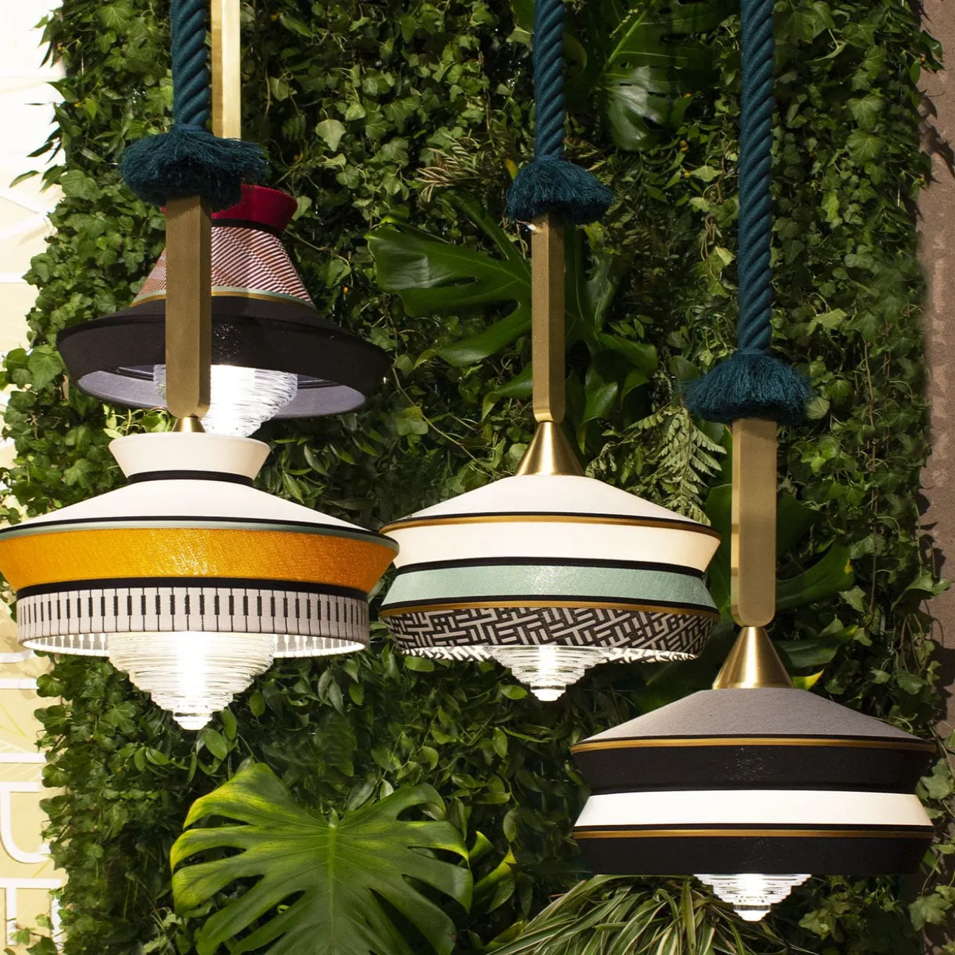 Calypso outdoor è un prodotto con grado di protezione IP65, quindi un vero e proprio Outdoor. I tessuti impermeabili e ignifughi sono adatti a resistere agli agenti atmosferici a temperature particolarmente alte o basse, mantenendo i colori e la qualità artigianale del prodotto. I cavi elettrici passano attraverso la corda marina di colore verde e la struttura portante, che è costituita da un massello levigato laccato oro opaco. La sorgente luminosa è alloggiata all’interno di un cilindro di vetro sigillato per garantire il grado di protezione IP65. Il diffusore è in vetro trasparente. Sorgente luminosa: 1 X E27 T8 Tubolare a LED ip65.