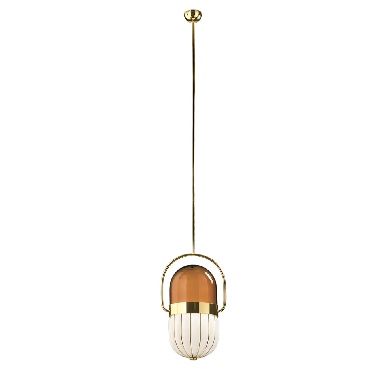 Parte di una collezione disegnata da Matteo Zorzenoni e chiamata così per la sua silhouette curva che ricorda una pillola, questa elegante lampada a sospensione a due luci è stata realizzata utilizzando la secolare lavorazione artigianale di Murano, con il vetro soffiato a bocca direttamente nella struttura metallica. L’effetto è un mix suggestivo in cui i due materiali si abbracciano e diventano un tutt’uno. I colori sono caldi e accoglienti e derivano dalla finitura ambrata del paralume e dall’oro galvanico del metallo. Il vetro può anche essere colorato: chiedete al Concierge per i dettagli. Certificazioni contrattuali e commerciali disponibili su richiesta.