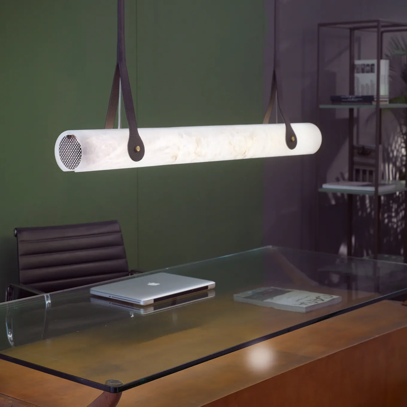 Ispirata ai potenti fulmini del dio greco Zeus, questa lampada a sospensione emette una luce forte e diretta da una lampadina LED (3000 K – 18W – 24V) racchiusa in un paralume cilindrico in alabastro bianco, o “pietra degli dei”. Abilmente lavorato a mano, il paralume pende dal soffitto con due fasce di cuoio di alta qualità, che aggiungono un fascino opulento a questo squisito pezzo di arredamento funzionale.