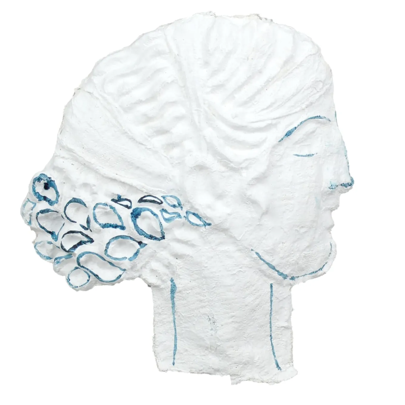 Una dichiarazione scultorea in qualsiasi stile di arredamento, questa splendida lampada da parete appartiene a una raffinata serie ispirata alle alseidi, le classiche ninfe delle radure e dei boschetti della mitologia greca. Realizzato in gesso garzato, il paralume, lavorato e dipinto a mano, è montato su una struttura cilindrica in ottone, completata da dettagli in ceramica, che sostiene una lampadina E14.