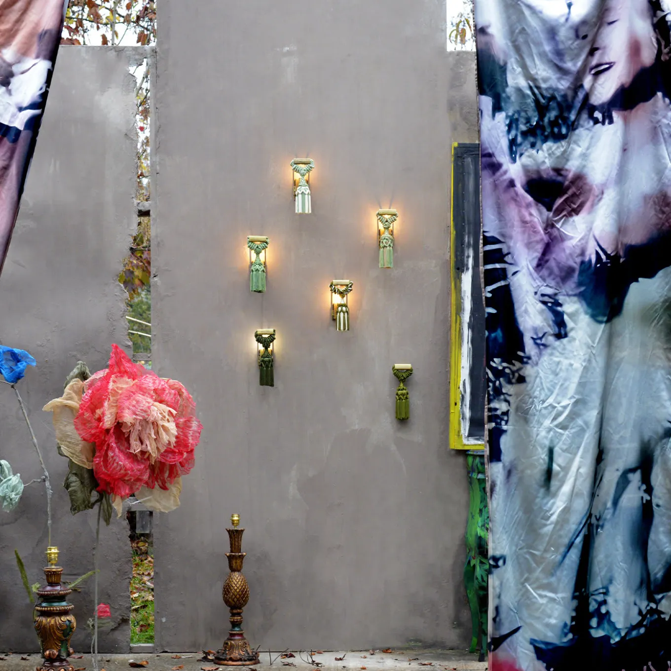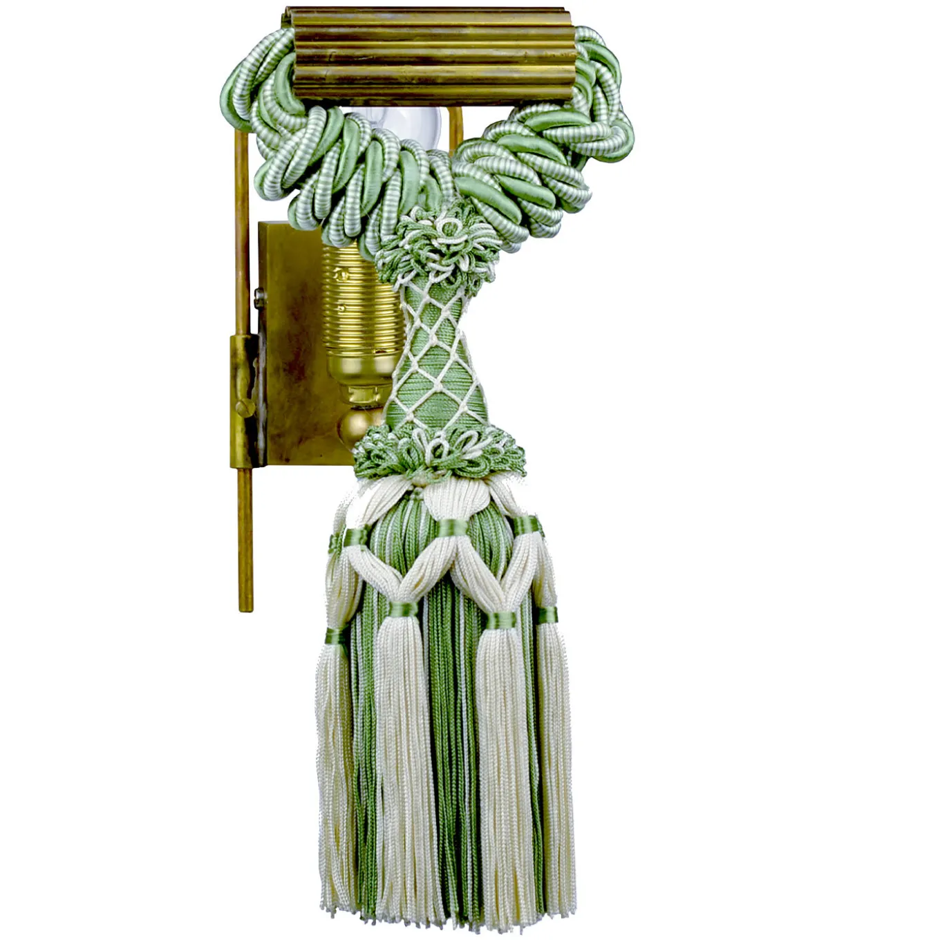 Elemento decorativo appartenente alla Scena II de “L’Incantatrice di serpenti”, questa lampada da parete è caratterizzata da nappe vintage in seta e viscosa del cordone delle tende francesi nei colori bianco e verde salvia, montate su una piastra posteriore in ottone non lucidato. L’elemento cilindrico in ottone scanalato che sostiene la nappina può essere utilizzato con i vari modelli della collezione. Perfetto come pezzo a sé stante o in coppia per affiancare uno specchio da ingresso, questo apparecchio di illuminazione supporta una singola lampadina E14.