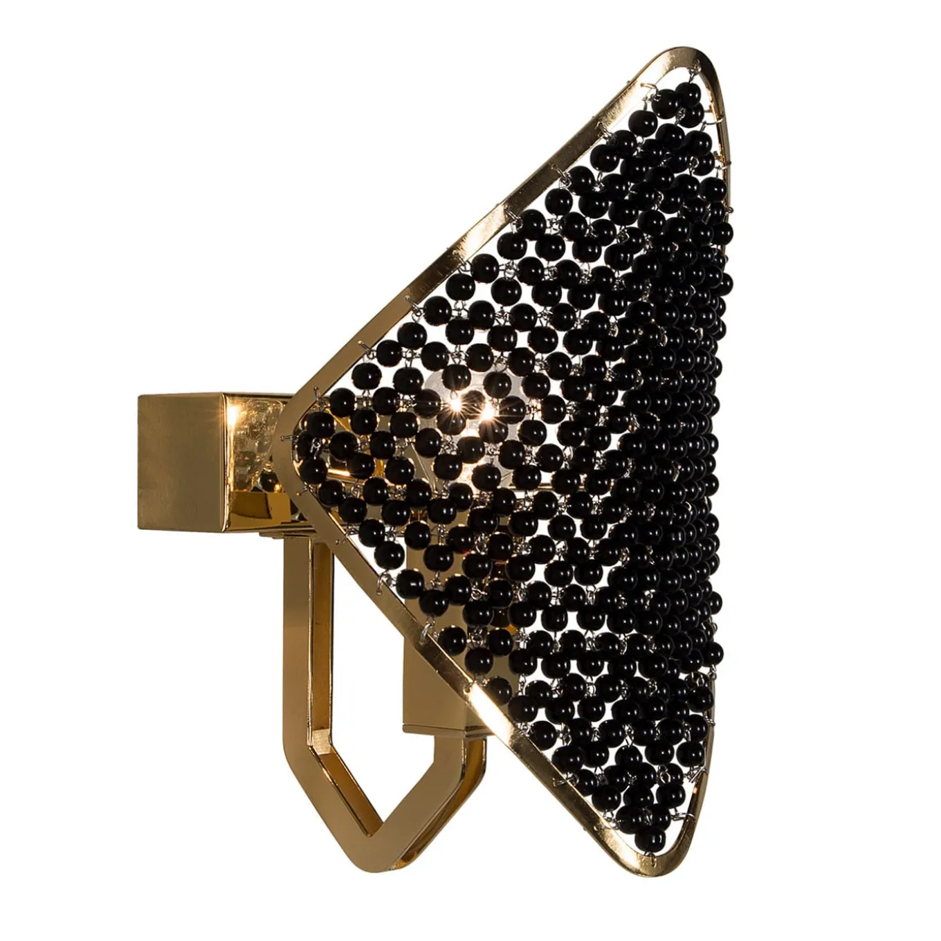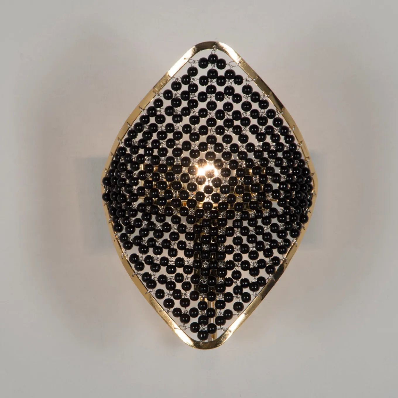 I modelli sono ottenuti disponendo i rombi su elementi ad anello di diverso diametro e ricordano la lavorazione dell’oro di alto livello. I moduli, socchiusi, sembrano gemme preziose variamente montate come bracciali, anelli o parure. La scelta delle sfumature di colore e delle finiture metalliche è pensata sempre per ottenere combinazioni che esaltino la preziosità del manufatto. Lampada da parete a 1 luce. Lampadina non fornita. Disponibile in dimensioni e finiture personalizzate. Metallo e cristalli. Placcato oro e perle nere.