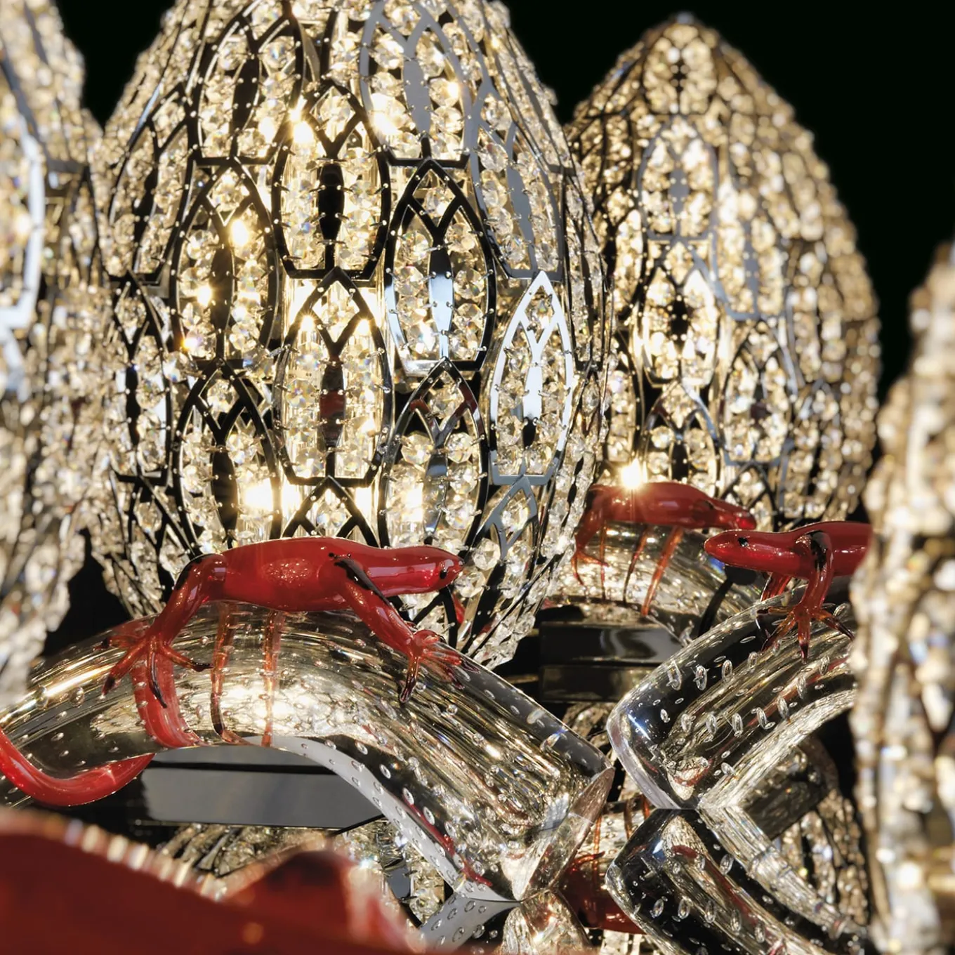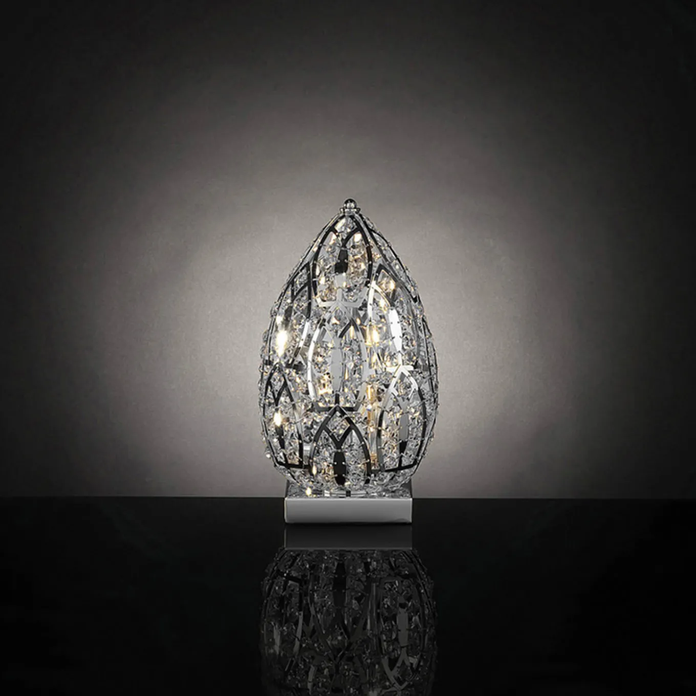 Una maglia in acciaio cromato di spiccata ispirazione arabescata e lussuosamente arricchita da cristalli pazientemente applicati a mano definisce questa elegante lampada da tavolo a forma di uovo. Sollevato su una base a plinto, il suo corpo estroso diffonde una luce stupefacente grazie all’interazione tra le fonti luminose e i cristalli. Si prega di esplorare le varianti di cristallo e di finitura con il Concierge.