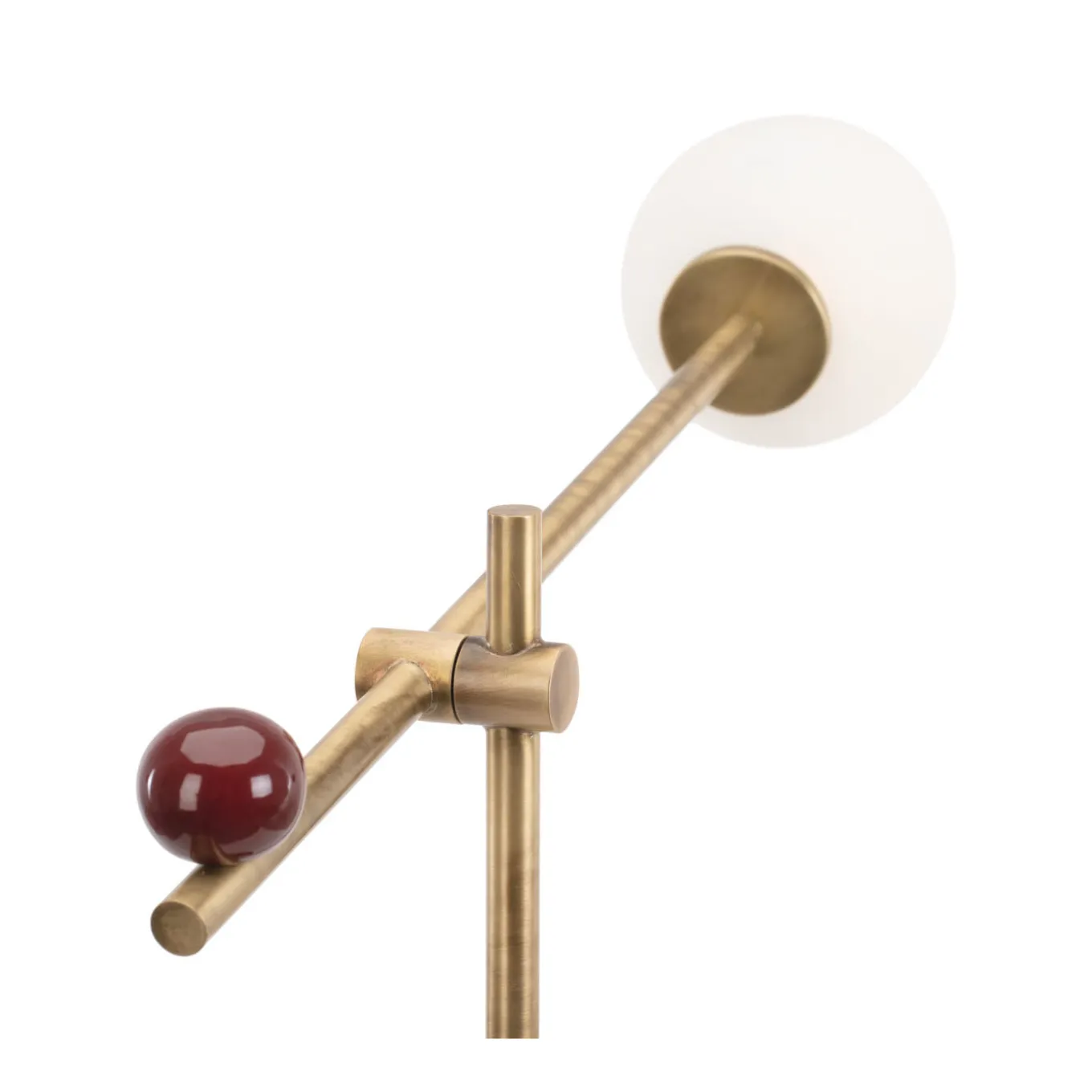 Elegante lampada da tavolo di medie dimensioni caratterizzata da una struttura patinata e forme dal fascino rétro. Il braccio inclinabile e regolabile offre versatilità d’uso, mentre la base in ceramica smaltata rosso profondo si abbina a un dettaglio coordinato sul braccio. Completano il design un diffusore sferico in vetro satinato, che diffonde una luce morbida ed elegante. Progettata da La Récréation – P. Angelo Orecchioni Arch., unisce funzionalità e raffinata estetica.