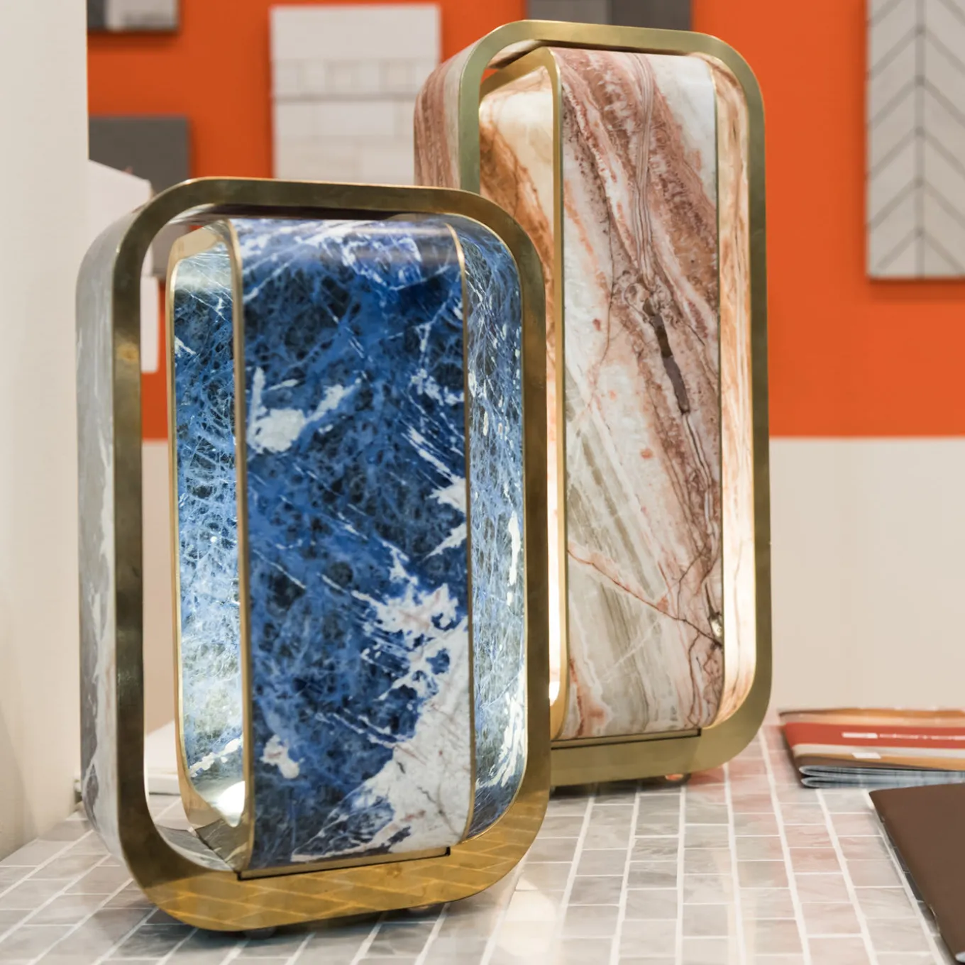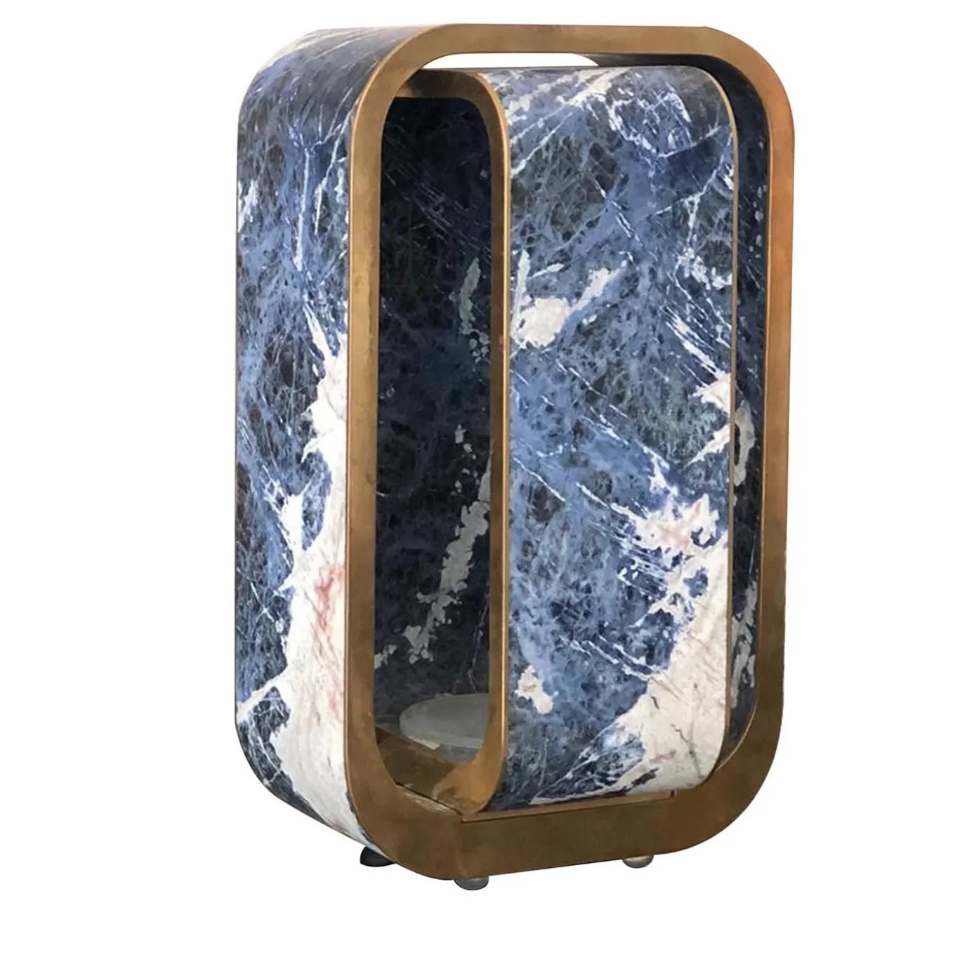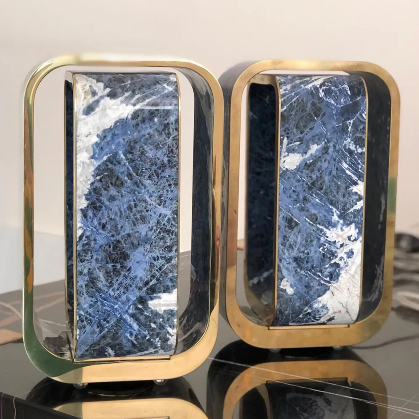 Esteticamente piacevole e funzionale, questa lampada da tavolo arricchisce qualsiasi superficie con il suo design glamour. La sua struttura è composta da due elementi montati in marmo pregiato e sodalite blu lucida. Gli angoli arrotondati sono rifiniti in ottone lucido e la combinazione di materiali crea un effetto suggestivo quando viene illuminata dalla sorgente luminosa a LED integrata.