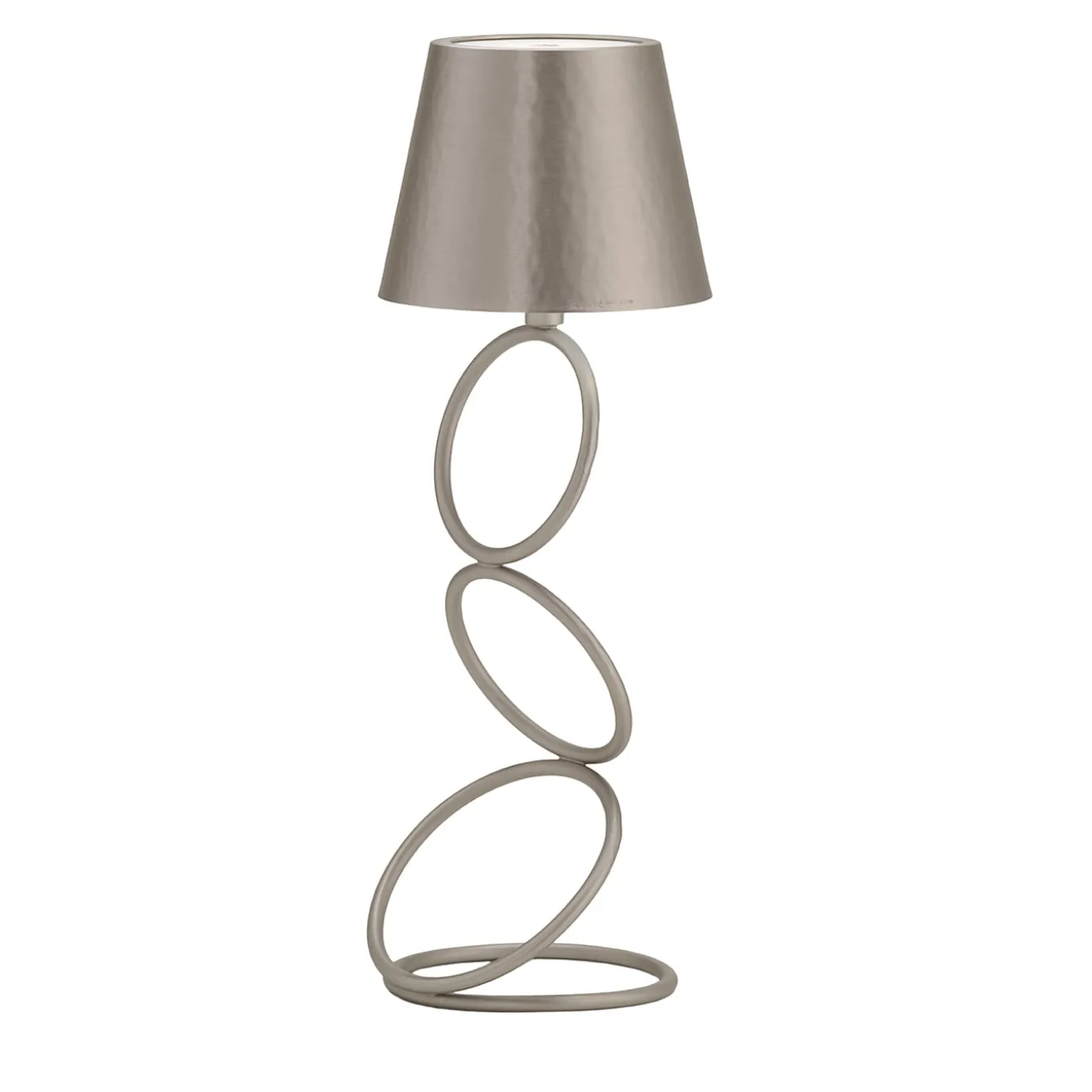 Scultorea ed eterea al tempo stesso, questa lampada da tavolo ricaricabile senza fili è una squisita sintesi di tratti glamour e minimalisti. Una dinamica composizione di anelli – base inclusa – traccia il suo corpo scultoreo in lega di ottone che, completato da un diffusore conico martellato a mano, sfoggia un’ampia placcatura in argento anticato che massimizza il potenziale di luminosità generale. Altre versioni sono disponibili nel catalogo Artemest.