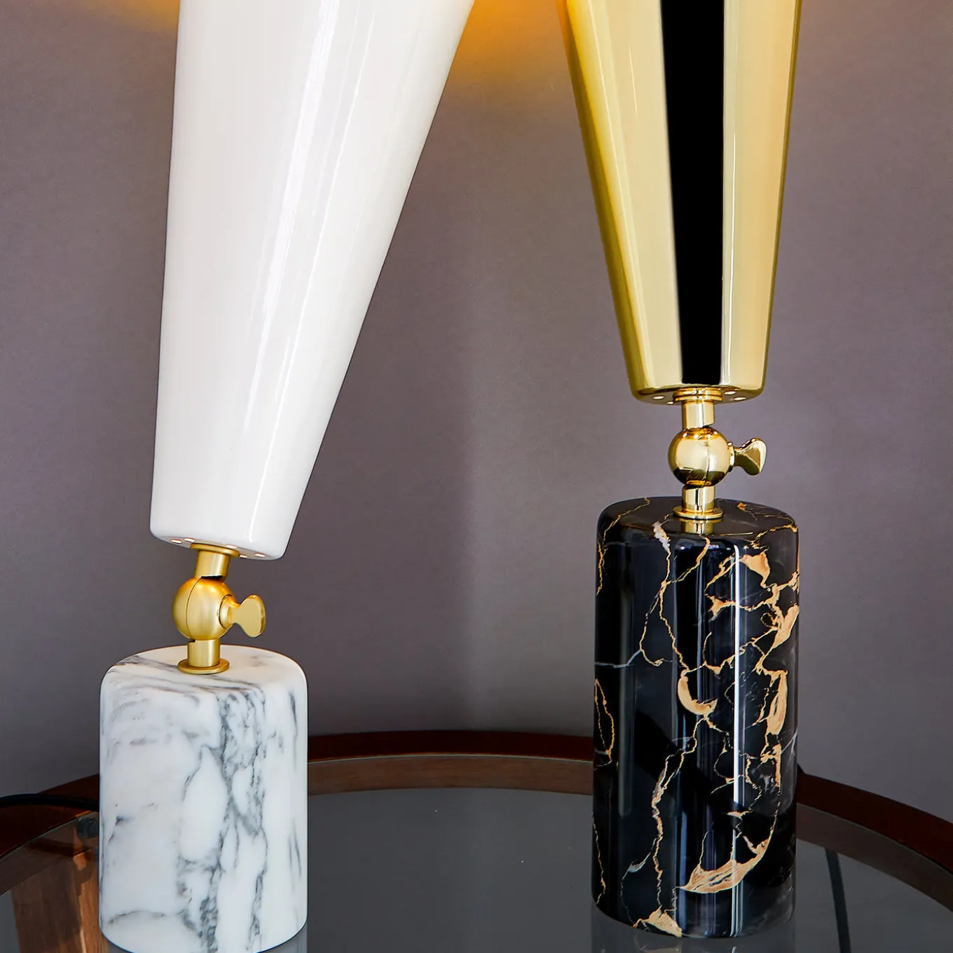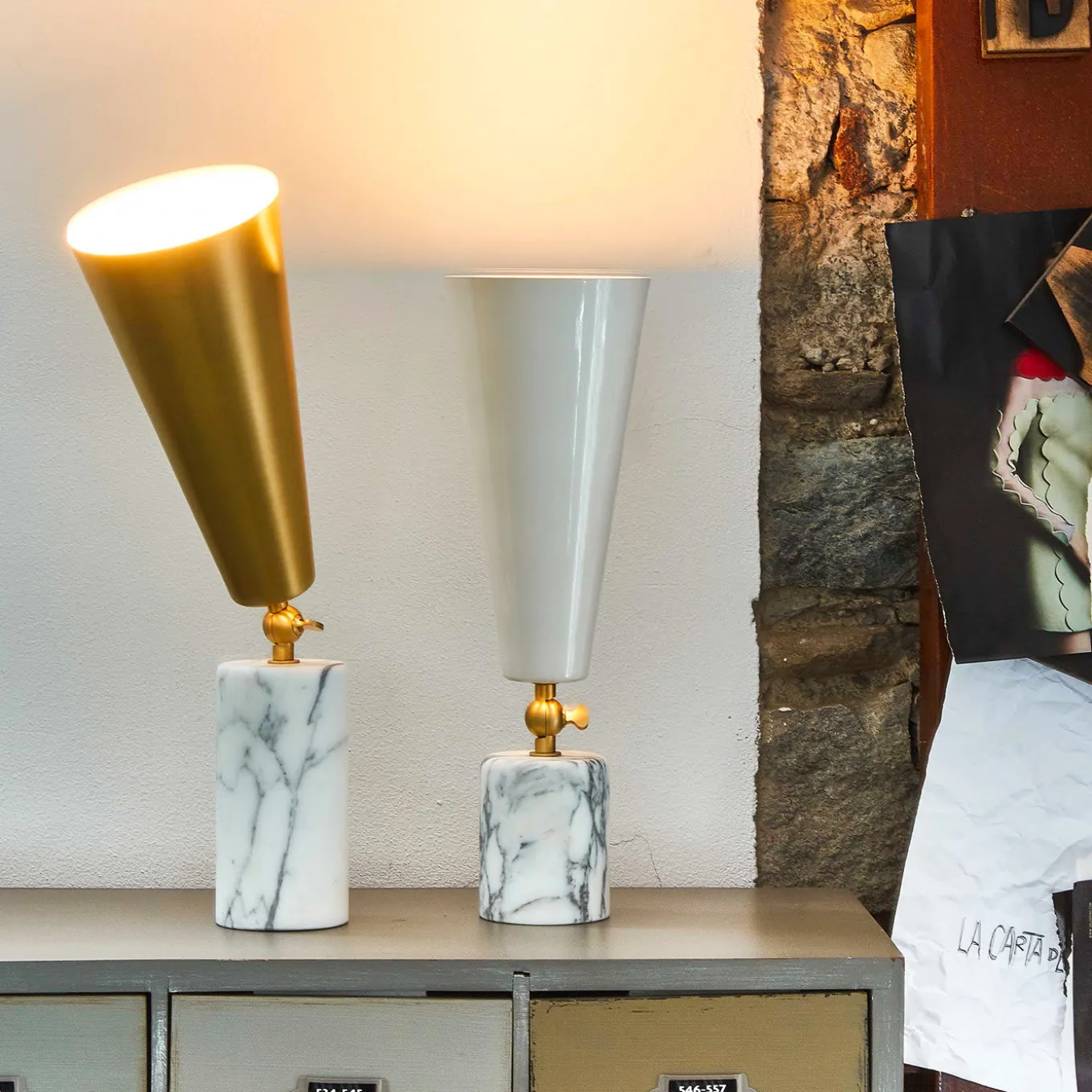 Questa suggestiva lampada da tavolo è caratterizzata da forme geometriche completate da materiali preziosi. La base cilindrica è in marmo di Carrara e lo snodo che la collega al paralume in vetro bianco è in ottone con finitura satinata.