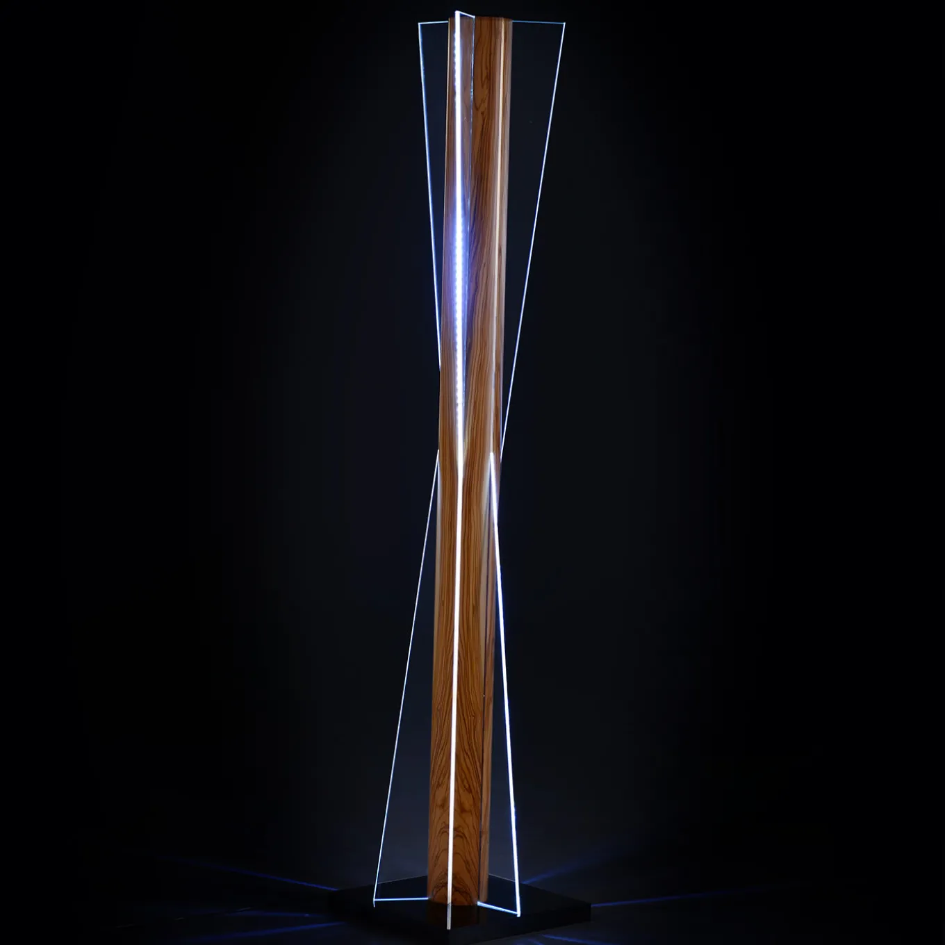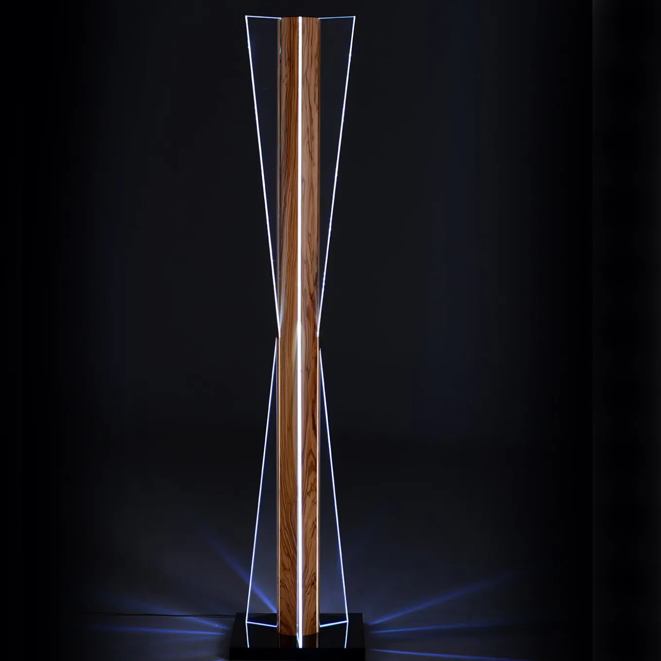 Questa elegante lampada da terra evoca la silhouette di una clessidra, antico simbolo del tempo, abbinata a una struttura in legno d’ulivo, che rappresenta il nutrimento, la tradizione e la vita. Il suo design è moderno e classico al tempo stesso, per un’eleganza e uno stile unici. Realizzata in legno d’ulivo, parapan e vetro temperato. Luce LED bianca. Fa parte della collezione Carpenteria dell’azienda.
