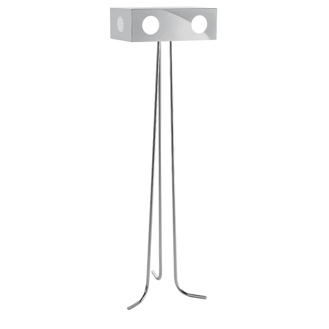 “Threeve è il personaggio di un film di fantascienza dell’Universo JCP, dove le nozioni del passato diventano gli elementi di un futuro imprevedibile e ciò che percepiamo come storia è ancora da vedere. Un piccolo robot dall’anima inaspettata, che illumina il non visto e ci aiuta a interpretare e trasformare la vita quotidiana.” Lampada da terra con struttura in metallo con finitura cromata. Sorgenti luminose interne con due lampadine LED bianco caldo diffuse attraverso una lastra di plexiglas bianco. Non sono disponibili varianti.
