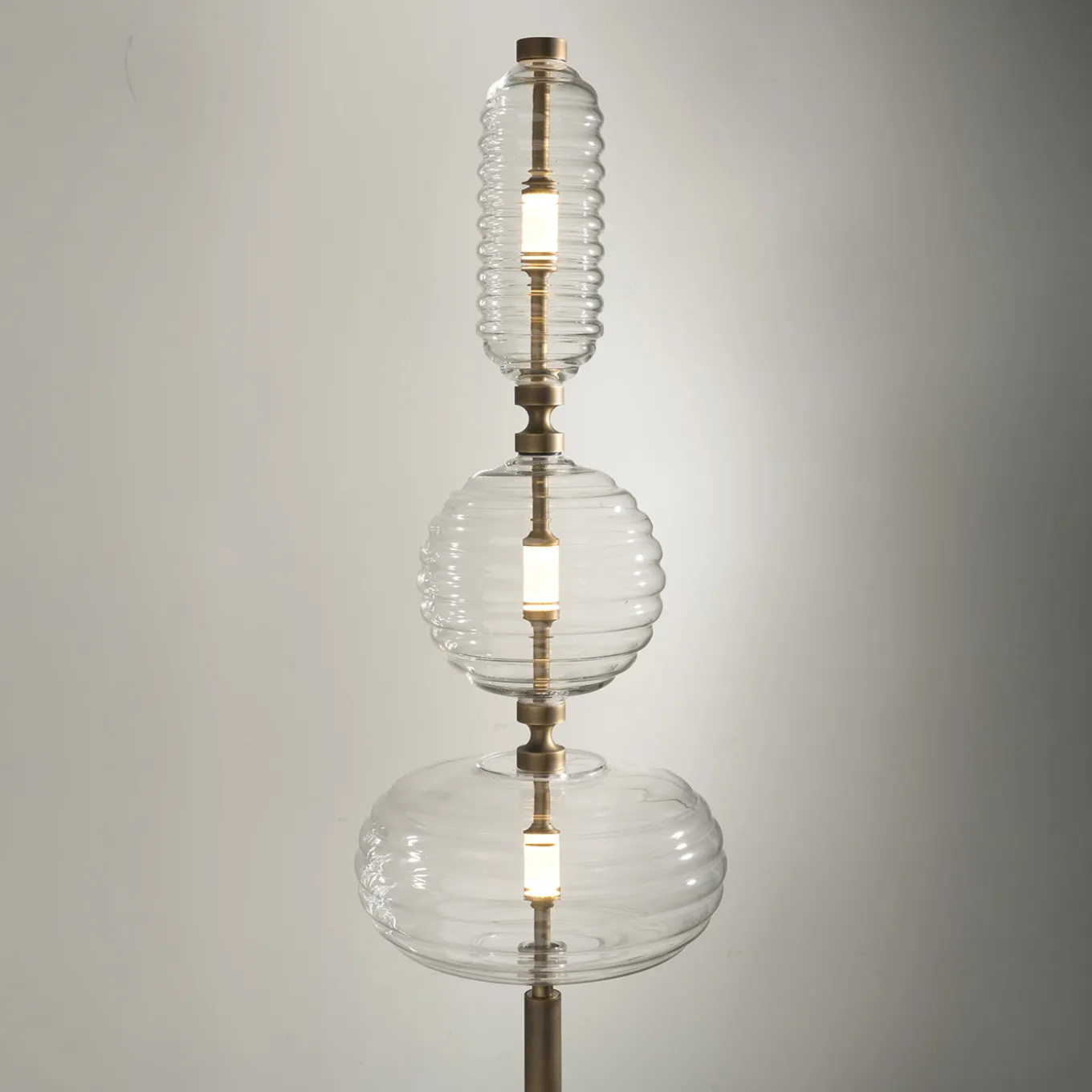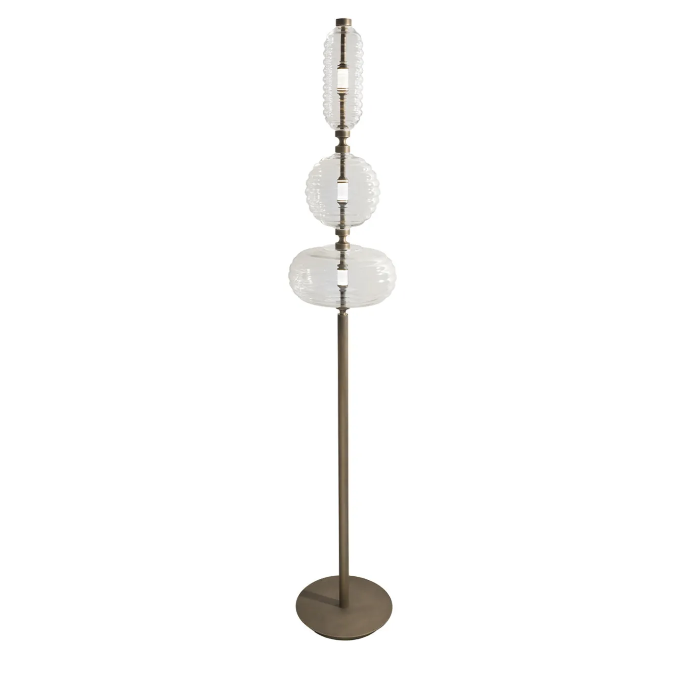 La lampada da terra Trinity 05 di Mike Shilov presenta tre moduli scultorei di vetro soffiato disposti verticalmente con rilievi a strisce orizzontali, ispirati alla tecnica di Murano “rigadin”. La finitura in bronzo chiaro accompagna le tonalità trasparenti, che ospitano tubi LED integrati bianco caldo (3 x 3w, 3000°k). Le connessioni modulari combinano senza soluzione di continuità le lampade in vetro e i supporti, bilanciando illuminazione moderna con artigianato elegante. Disponibile anche in finiture in nickel satinato e ottone brunito. Le lampadine sono incluse. Si prega di contattare il concierge per ulteriori informazioni.