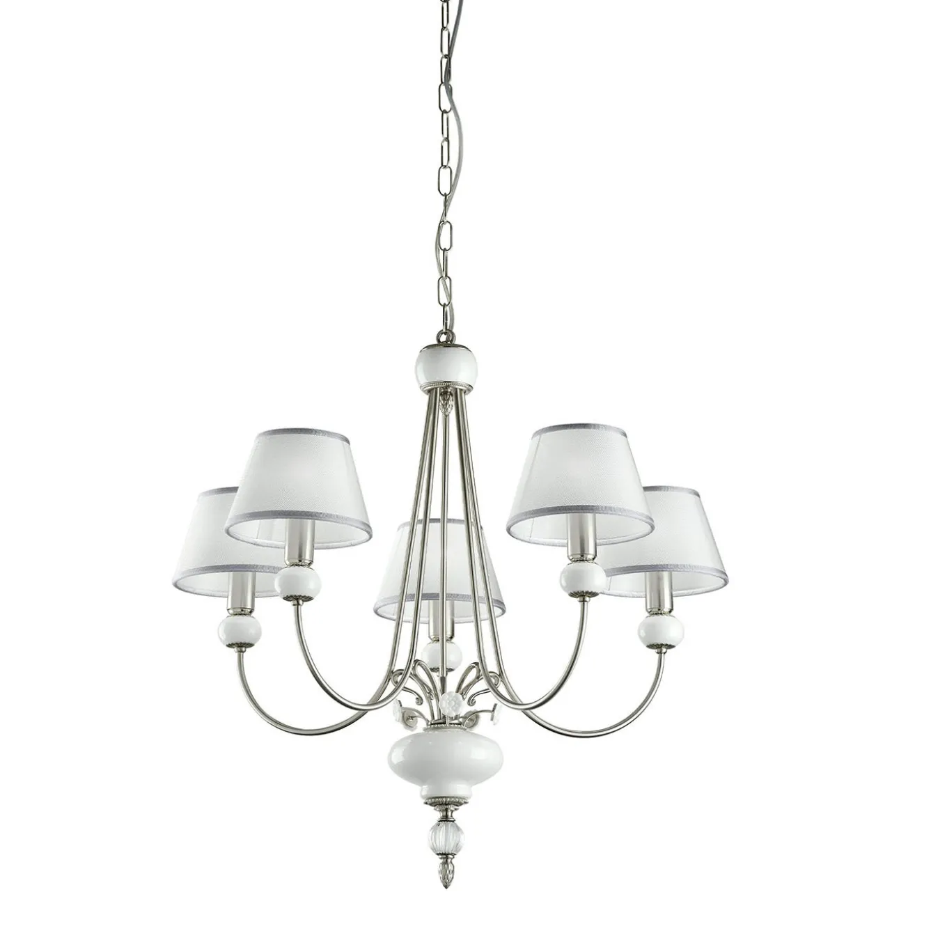 Combinazione perfettamente armoniosa di materiali, forme e tonalità, questo delicato lampadario sarà un’aggiunta sontuosa e gloriosa a interni raffinati. Elegante e pulita, la struttura in metallo spazzolato e rifinito in nichel lucido presenta cinque bracci curvi e splendidi supporti in porcellana bianca. Arricchito da un’unica sfera di vetro rigato che ne segna la base, presenta cinque paralumi in tessuto rigido bianco che supportano lampadine E14 max 40W.