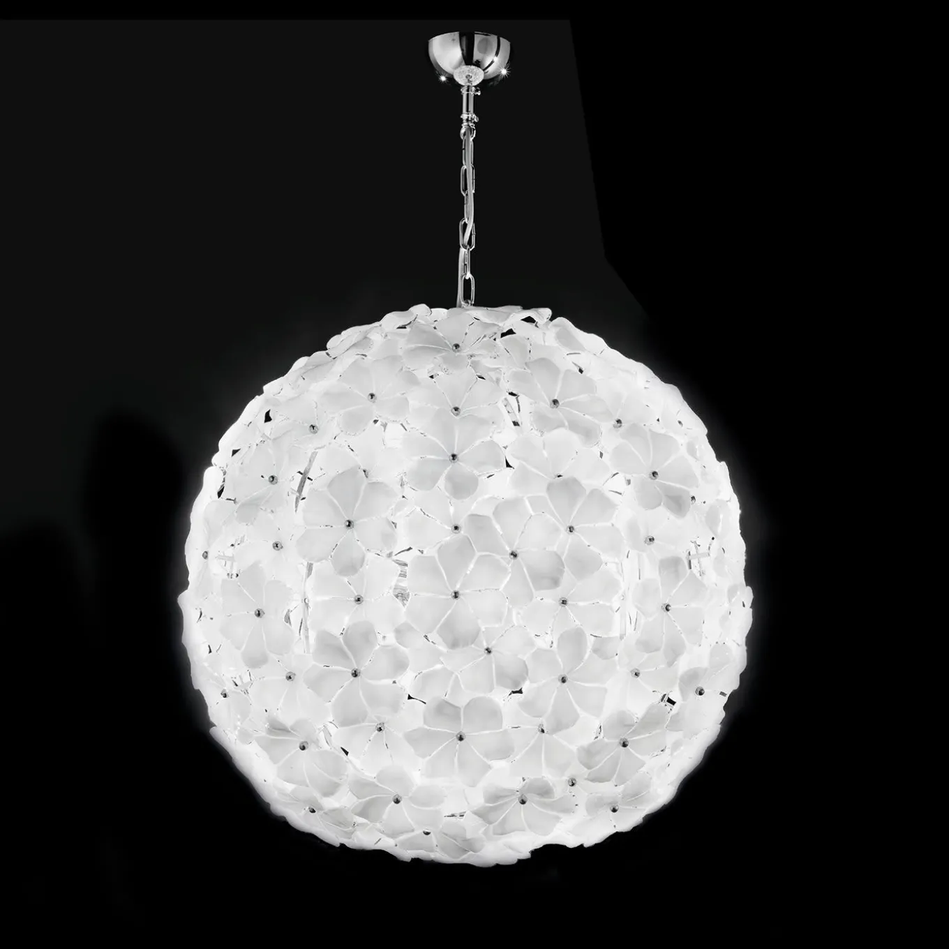 Fate risplendere la vostra luce con questo splendido lampadario moderno in vetro. La struttura rotonda del lampadario è composta da piccoli fiori di vetro trasparente, tutti collegati tra loro a formare una forma sferica. Una struttura cromata sostiene questo splendido lampadario, che farà sicuramente la sua figura nell’illuminare qualsiasi ambiente.