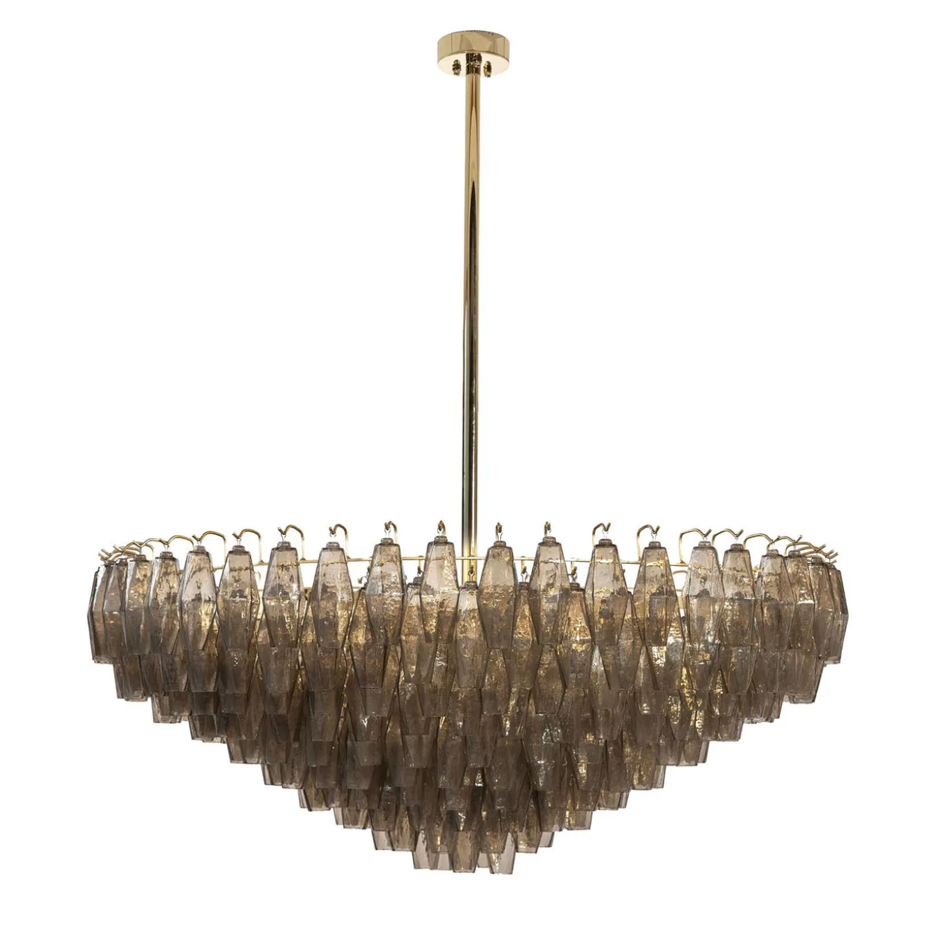 Questo elegante lampadario è realizzato in poliedri di vetro fumé e offre una raffinata reinterpretazione dei modelli progettati da Carlo Scarpa per Venini negli anni ’50 e ’60. La sua struttura geometrica modulare forma una silhouette slanciata e piramidale che mette in evidenza la verticalità e il fascino sofisticato del lampadario. La finitura in ottone spazzolato aggiunge calore e raffinatezza, mescolando il rigore del design modernista italiano con la maestria artigianale veneziana. Una presenza straordinaria e senza tempo per qualsiasi interno. Le dimensioni, i colori e le finiture sono completamente personalizzabili su richiesta. Per ulteriori informazioni, si prega di contattare il Concierge. Le lampadine non sono incluse.