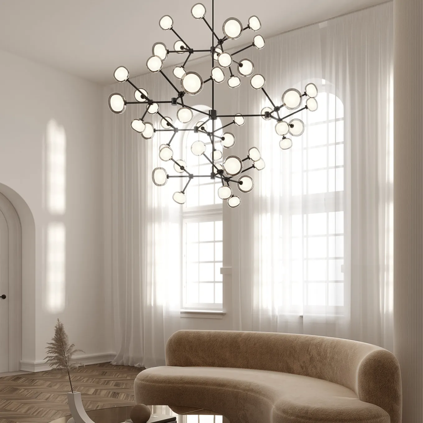 Imponente lampadario geometrico con una struttura elaborata in nero opaco, valorizzata da dettagli in ottone spazzolato. Composto da quarantotto globi sferici in vetro borosilicato a doppia emissione, emette una luce soffusa e avvolgente che valorizza gli ampi interni contemporanei. Disegnato da Corrado Dotti, questo pezzo crea un forte impatto visivo, fungendo da elemento centrale audace e raffinato in ambienti moderni.