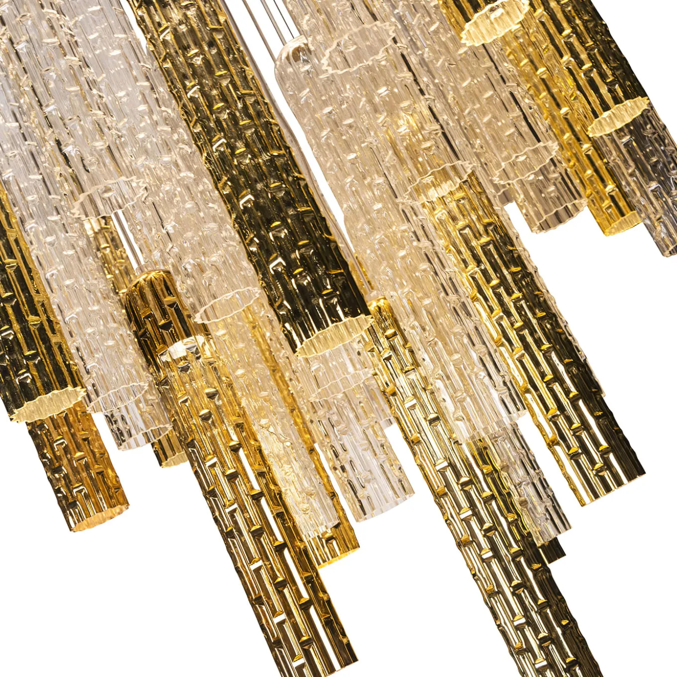 Composto da cilindri in vetro di Murano lavorati a mano che combinano finiture trasparenti con finiture lucide e raffinate in oro 24 carati, questo magnifico lampadario sarà un’aggiunta audace a un ambiente elegante. Il rosone del soffitto è in metallo laccato oro e presenta cinque sorgenti luminose a LED (LED 60° GU10 – 7W), abbinate alle lampadine a LED inserite nei cilindri (LED 36° GU10 – 7W).