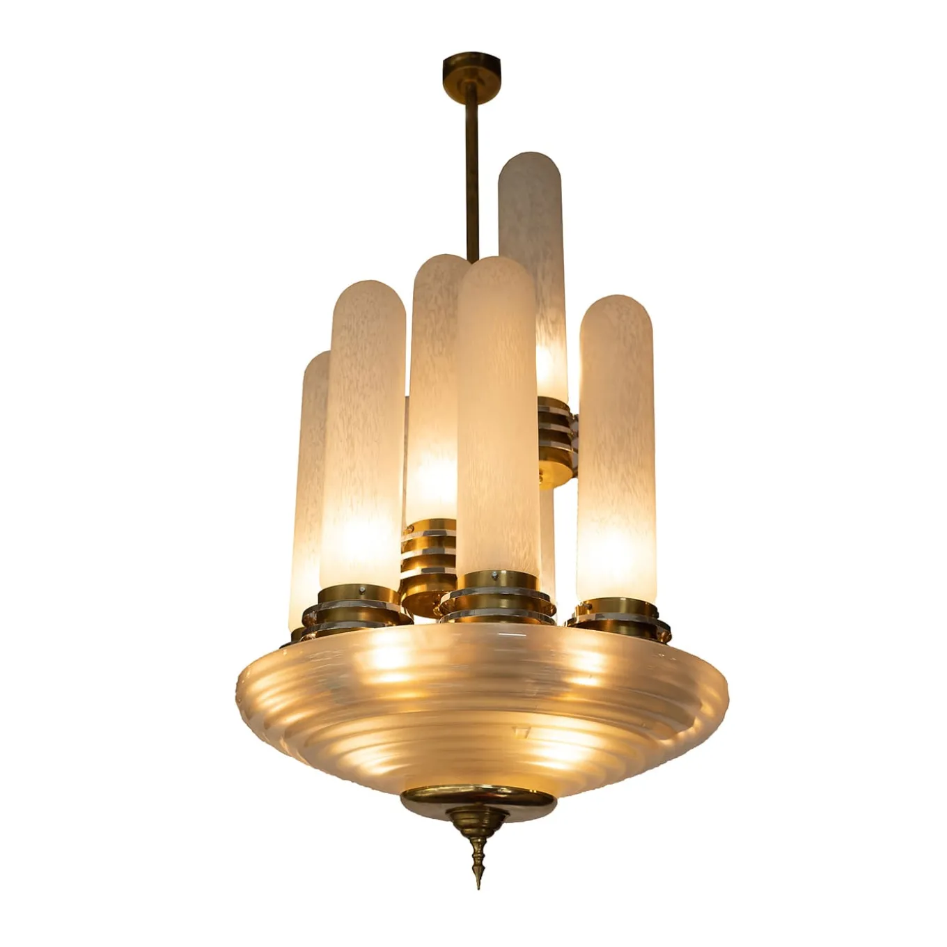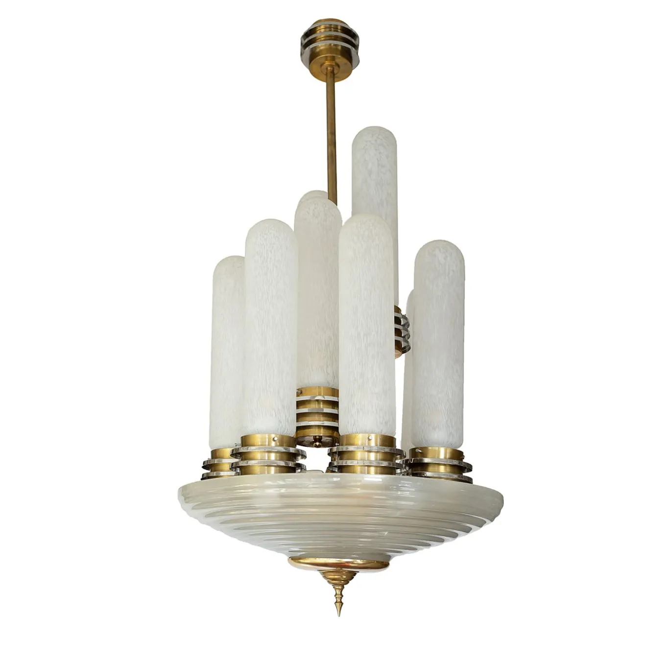 Splendida vetrina di artigianato, questo lampadario con struttura in ferro e ottone si distingue per il design scultoreo dei diffusori tubolari in vetro di Murano opaco. Ogni lampadina è alloggiata in ogni tubo (staccabile), la cui disposizione dinamica è sostenuta da una lastra di vetro scanalata e conica arricchita da un tocco di nero. Un complemento ideale per gli arredamenti di ispirazione vintage.