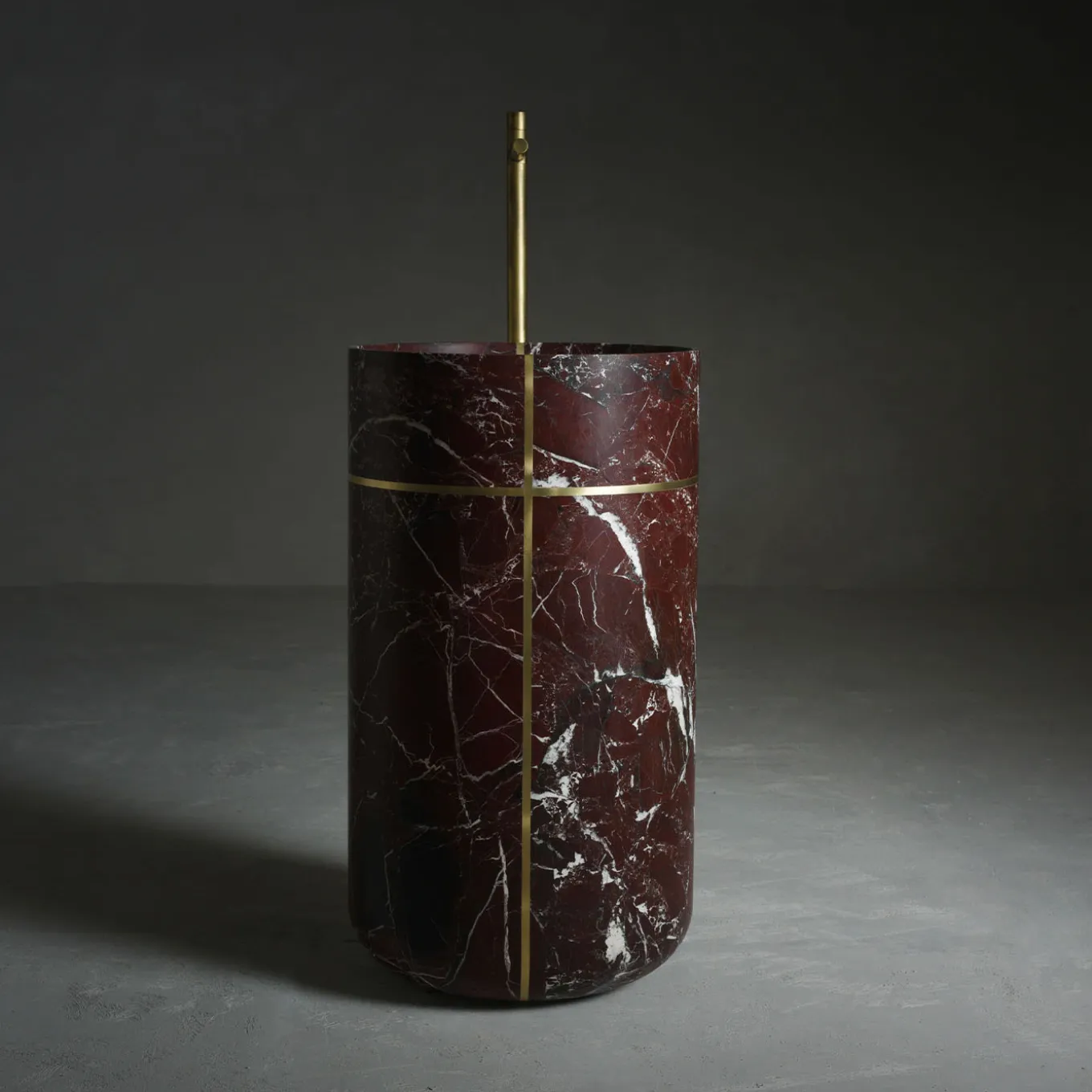 Disegnato da Marco Piva, il lavabo freestanding Tao è un blocco cilindrico di marmo, intersecato verticalmente da una sottile fascia di ottone. Una fascia perpendicolare nella stessa finitura attraversa il piano, evidenziando la profondità del lavabo. Questa maglia decorativa permette di utilizzare blocchi di marmo più piccoli o diversi, riducendo al minimo gli sprechi. Tao unisce eleganza e sostenibilità, offrendo un design versatile e adattabile a diversi spazi. Contattare il Concierge per le opzioni di personalizzazione. Rubinetteria non inclusa.